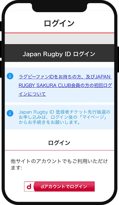 ② Japan Rugby ID登録時またはログインページよりdアカウントでログインする。