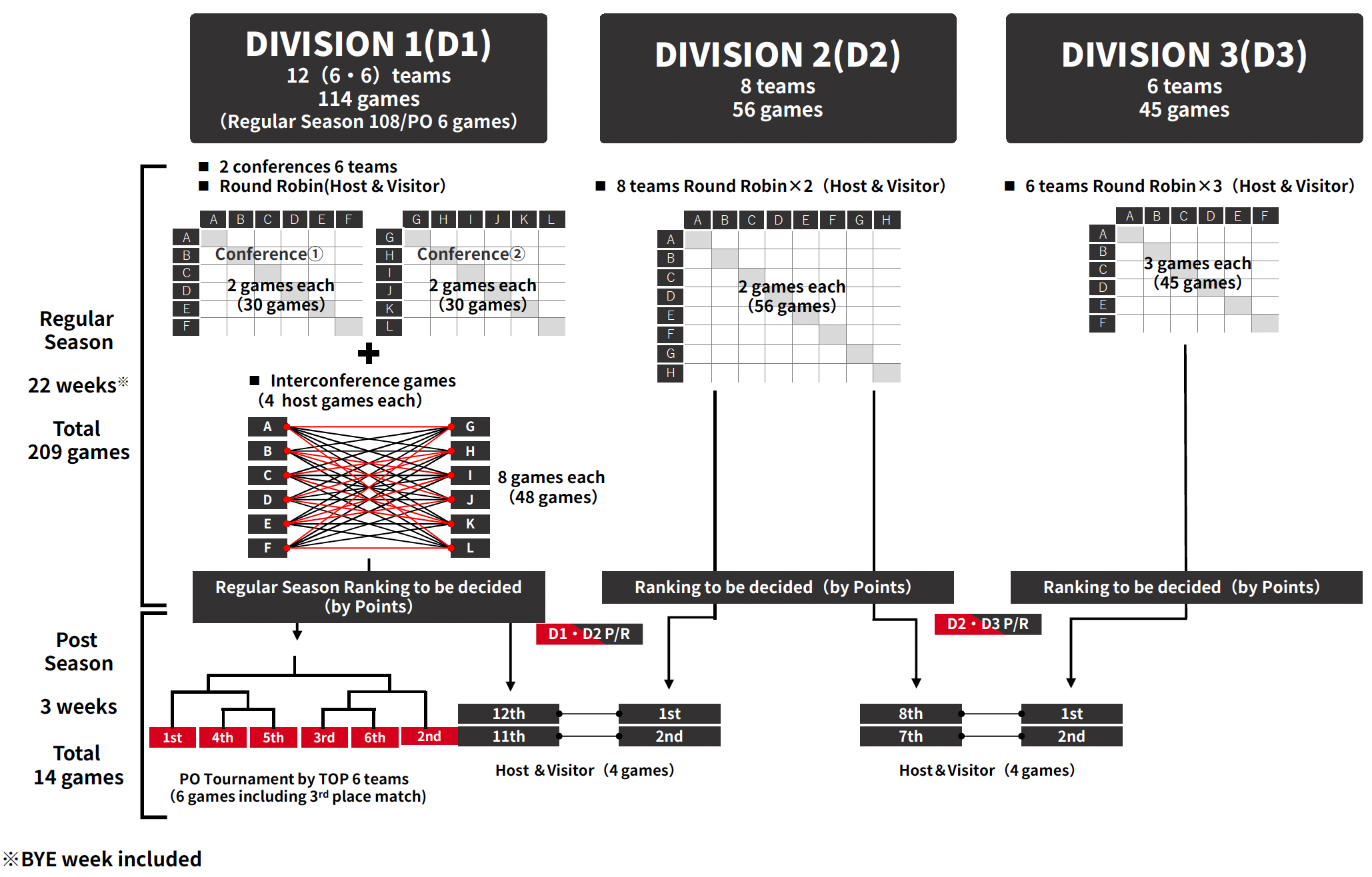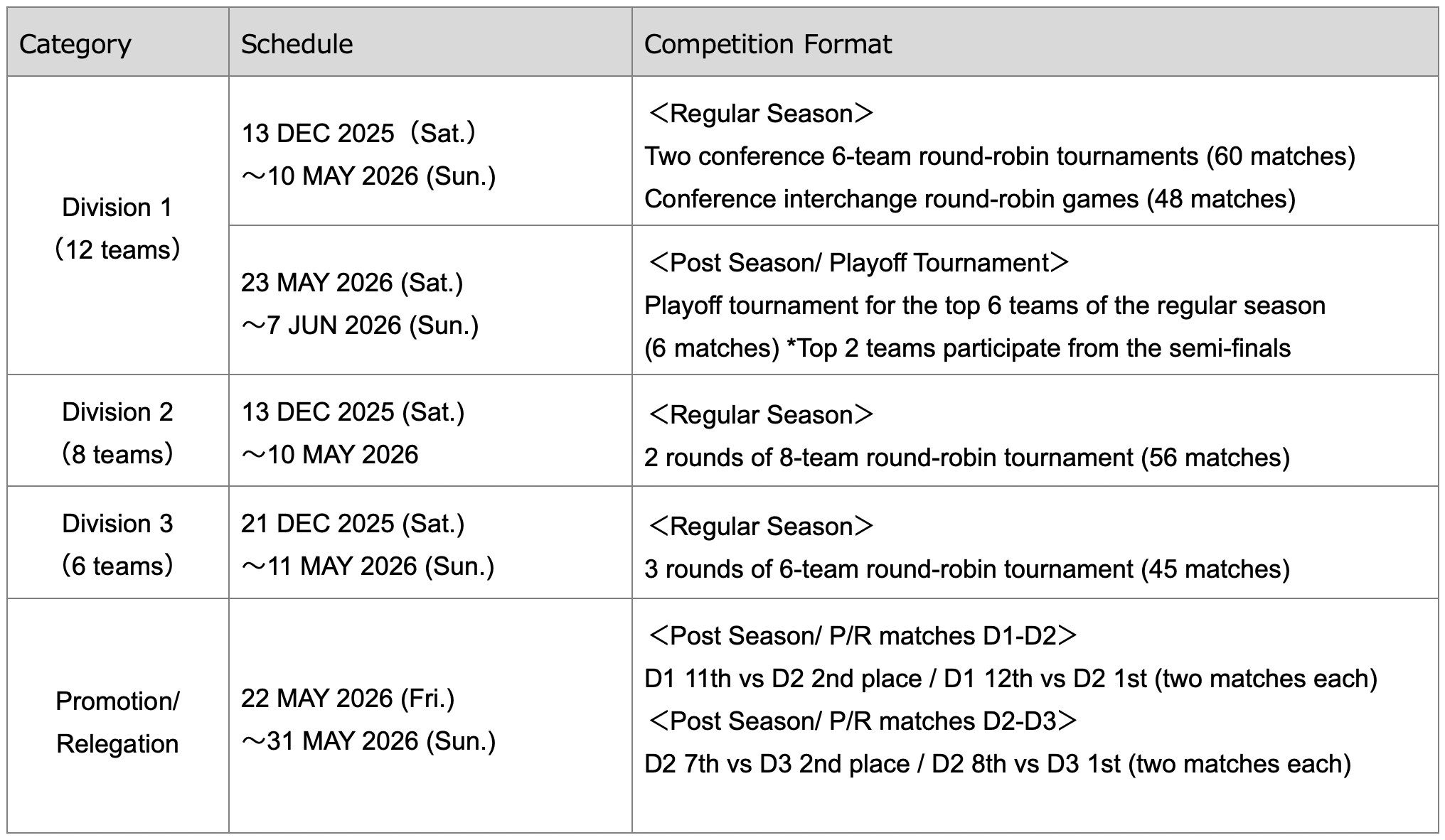 The tournament format for each division will remain unchanged from the 2024-25 season. D1 will consist of a league competition between two conferences and a playoff tournament involving six teams, with a total of 114 matches to determine the annual champion. The regular season will divide the 12 teams into two conferences, with each conference playing a home-and-away round-robin format (10 matches per team, with 5 home matches). Additionally, each team will play two home-and-away matches against two teams from the other conference (four matches per team, including two home matches), for a total of 108 matches.