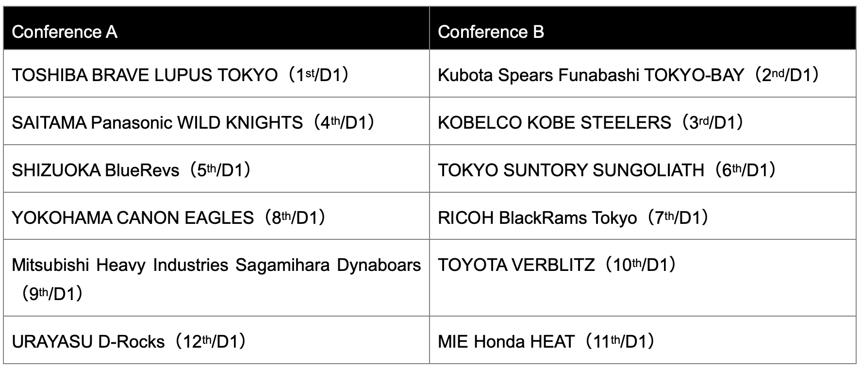 *Conferences are assigned based on the rankings of NTT Japan Rugby League One 2024-25.