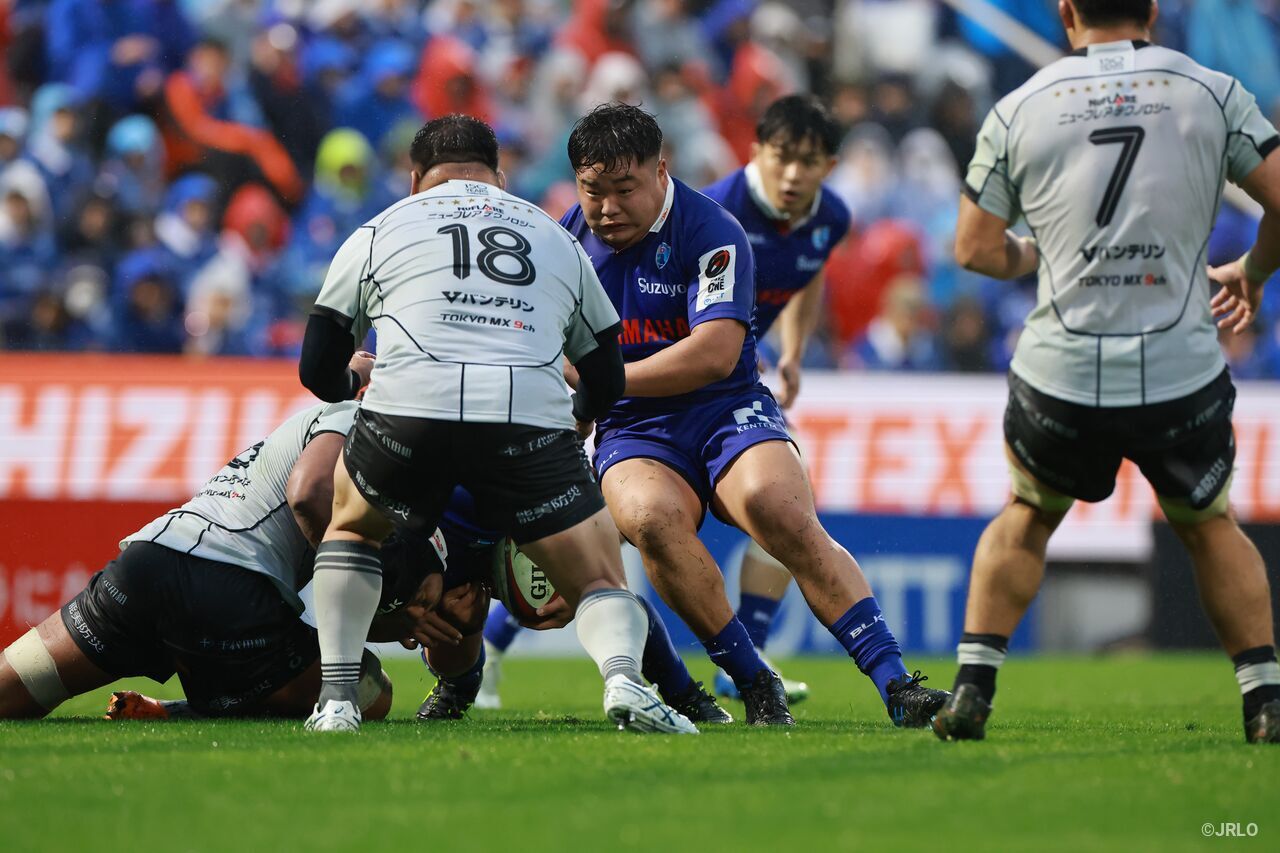 前半は、大敗した開幕戦の雪辱を期す東芝ブレイブルーパス東京の気迫に圧される展開となり、武器であるスクラムでも優位に立てなかったが、後半は今後に向けて一つの光明があった。左プロップに山下憲太、右プロップに稲場巧を投入してからスクラムに押し勝ってペナルティを奪うシーンが増え、反撃モードを力強く後押しした。