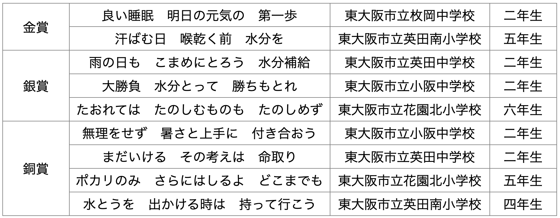 昨年に続き、同プロジェクトの一環として、東大阪市立英田南小学校と東大阪市立花園北小学校、東大阪市立枚岡中学校、東大阪市立英田中学校、東大阪市立小阪中学校において、大塚製薬株式会社様と協力し、熱中症対策を推進する熱中症対策標語コンテストを実施しました。