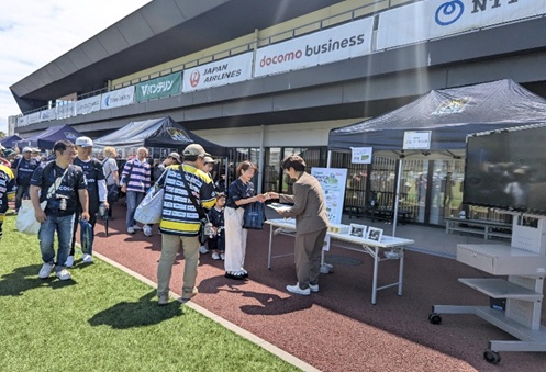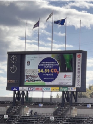 また、試合当日の会場では、来場客の認知度向上を目的に、CO2排出量の速報値の提示や、本取り組みに関するアナウンスとビジョン投影を実施しました。