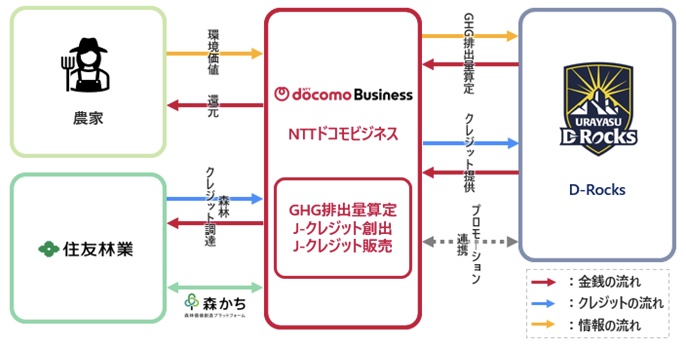 NTTドコモビジネスでは、農業由来J-クレジット「Green Natural Credit」と、住友林業との共創によるプラットフォームサービス「森林価値創造プラットフォーム」(以下、森かち)で取り扱う森林由来J-クレジットの2種類を展開・提供しております。今回の取り組みではこれらを活用することで、スポーツを通じた環境意識の向上と地域社会との連携を図っています。