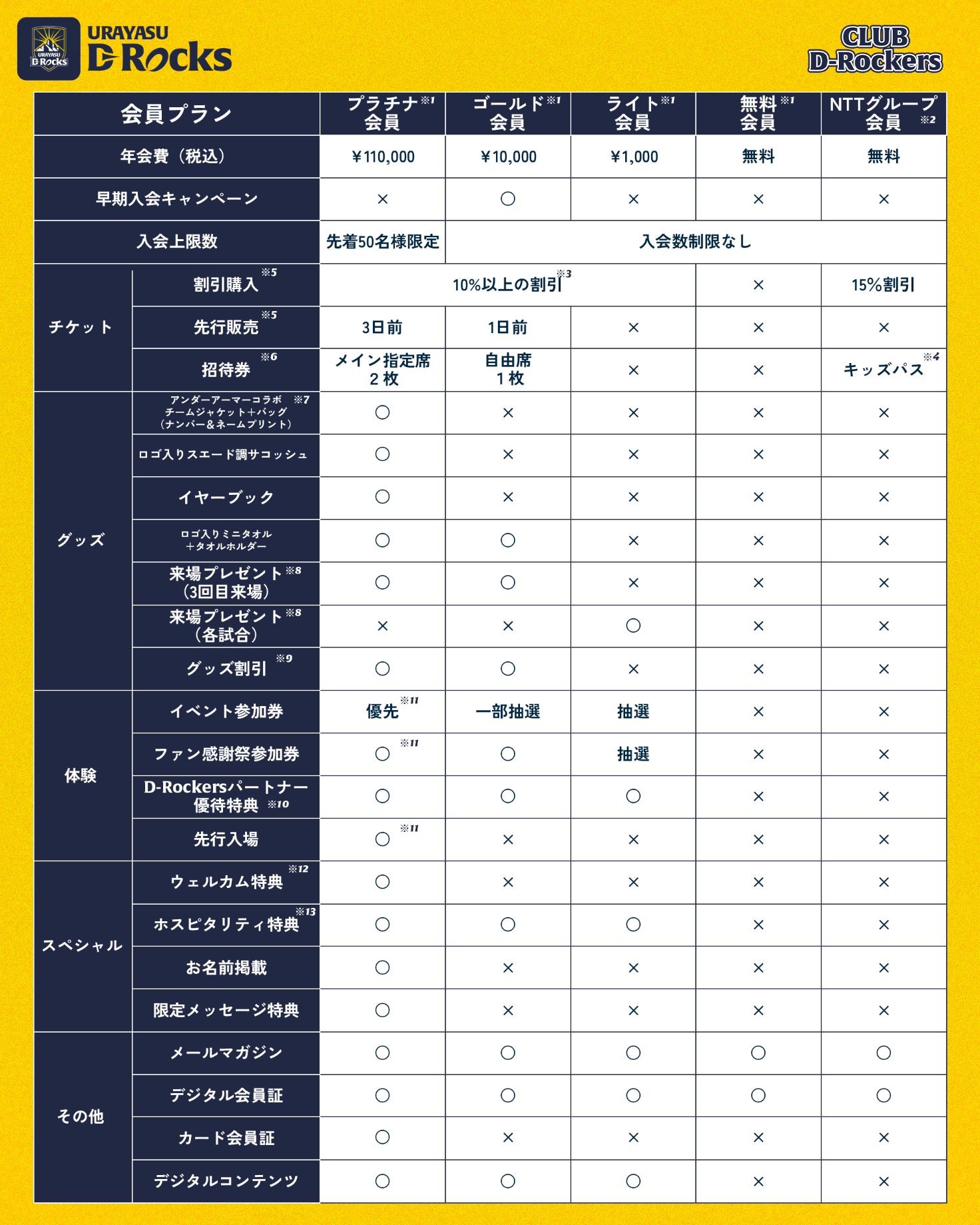 | 入会方法 | 浦安D-Rocksファンクラブ「Club D-Rockers」公式サイトにて受付 「Club D-Rockers」へのご入会には「D-Rockers ID」のご登録が必要となります。 https://auth.urayasu-d-rocks.com/login/sign_in |
