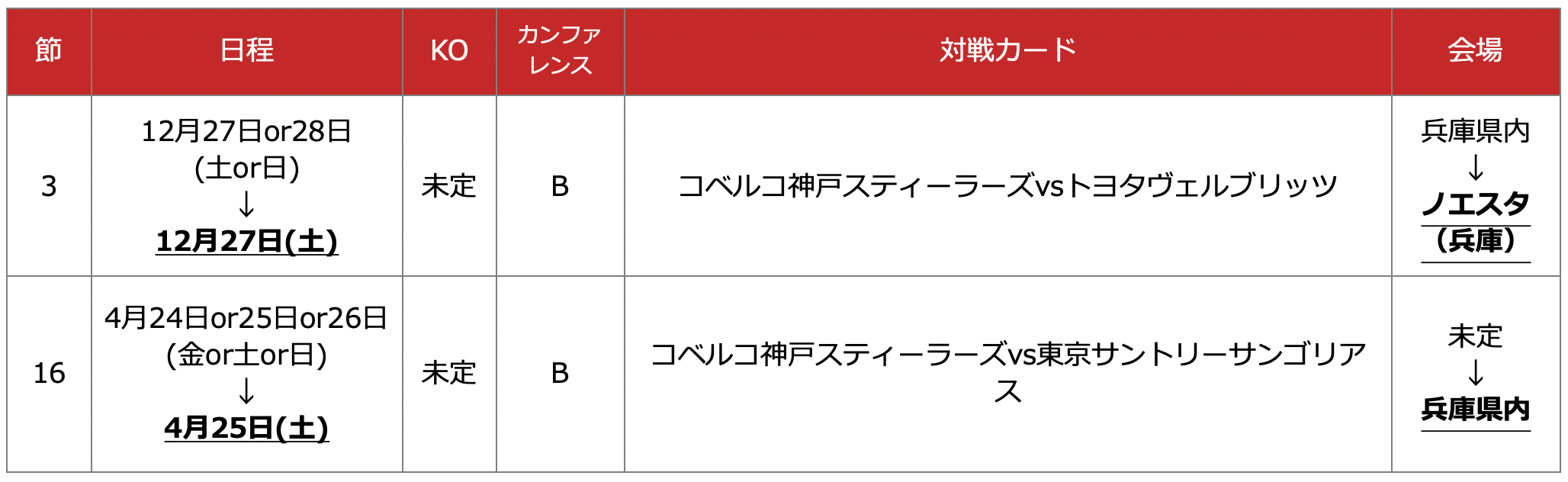 2025.10.03NTTジャパンラグビー リーグワン2025-26 一部試合日程および会場追加決定のお知らせお知らせ#ディビジョン1NTTジャパンラグビー リーグワン2025-26の試合日程および会場について、以下の通り追加決定がございましたので、お知らせいたします。試合日程および会場追加決定※以下、下線・太字が追加決定箇所■ディビジョン1※ノエスタ:ノエビアスタジアム神戸ニュース一覧