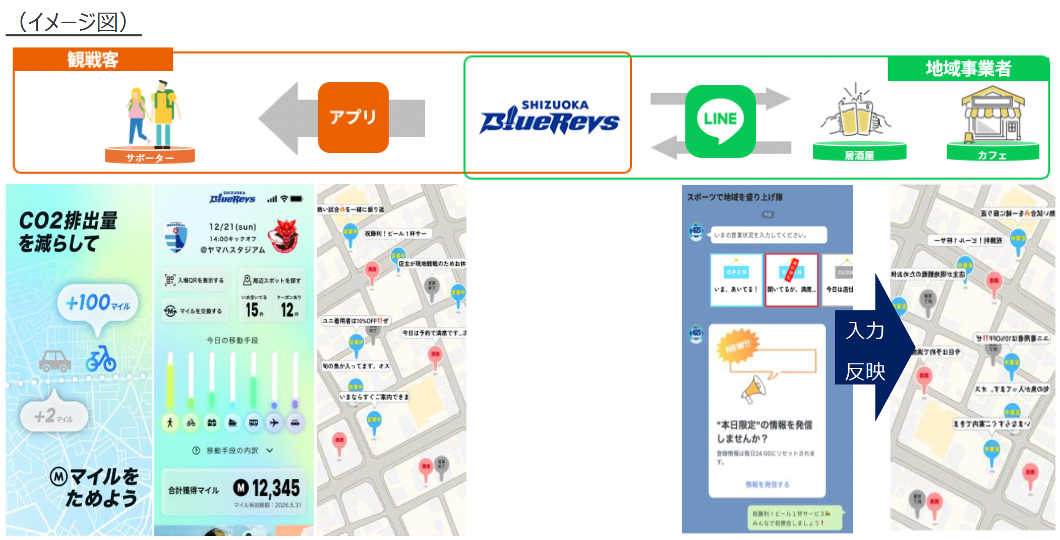 ①で付与されたポイントを試合前後のイベントの参加や地域飲食店の割引などに使用できるサービスを検討していきます。