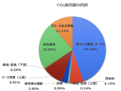事業活動における総排出量は、昨シーズン比109%となりました。主な増加要因としては、レギュラーシーズンの試合数増加(16→18)及びプレーオフトーナメント進出による