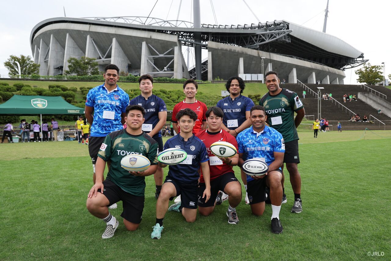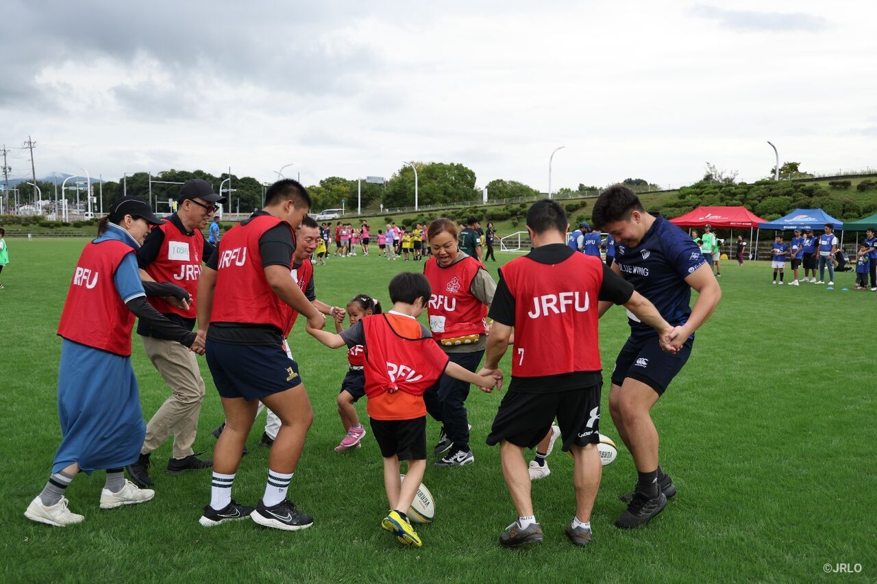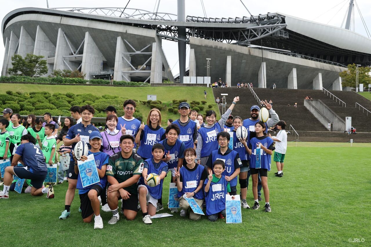 このイベントは、日本ラグビーフットボール協会(JRFU)、ジャパンラグビーリーグワン(JRLO)、国際協力機構(JICA)による三者連携協定に基づき、豊田市後援のもとに実施され、トヨタヴェルブリッツ、豊田自動織機シャトルズ愛知をはじめ、リーグの垣根を越えて、同エリアを拠点とする豊田通商ブルーウィング、中部電力ラグビー部のスタッフ・選手が参加。当日は約100名の参加者が集まり、日本のみならず、そのうち約30名はニュージーランド、台湾、スリランカ、ブラジルなど、多彩な国籍の方々にご参加いただき、会場は終始、笑顔と活気に包まれ、ラグビーを通じて、国籍や年齢、性別を超えてつながる温かい交流の輪が広がりました。