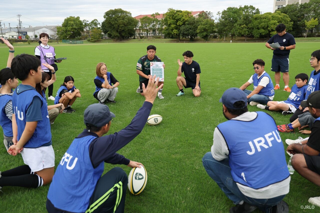 講師は、横浜キヤノンイーグルスのコーチ・古川新一さん。古川さんは、JICA海外協力隊員としてスリランカでラグビー隊員として活動された経歴を持ち、国際交流とラグビーを融合させた経験に基づく、実践的でわかりやすい指導を行ってくださいました。