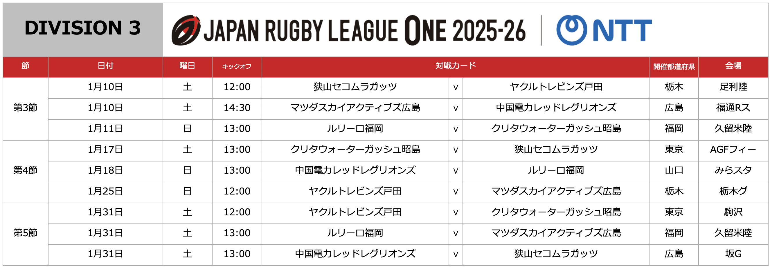 NTTジャパンラグビー リーグワン2025-26 ディビジョン1の第4節から第7節、ディビジョン2・3の第3節から第5節のキックオフ時間が決定しましたので、お知らせいたします。
