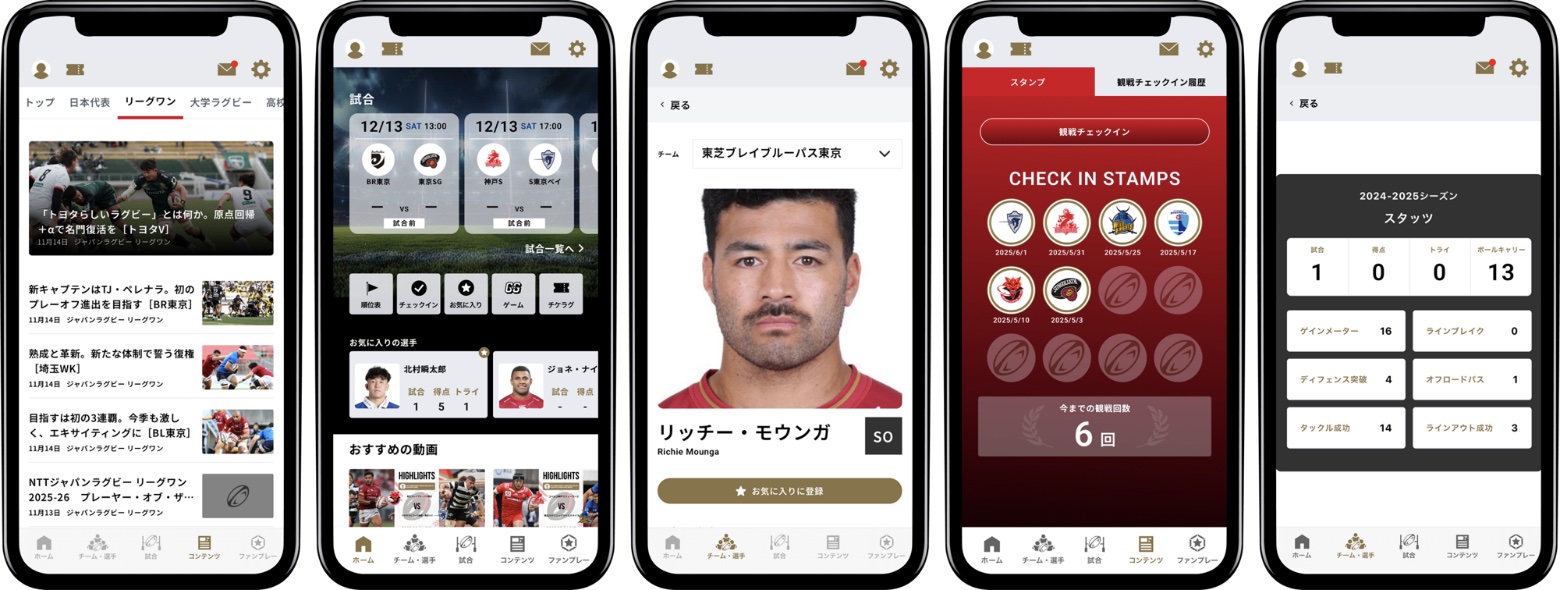 - 得点やトライ数などに加え、タックル数、ゲインメーター、ラインブレイク数など各選手のスタッツデータが確認可能に。