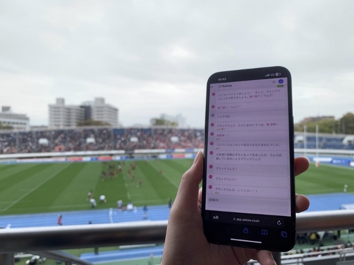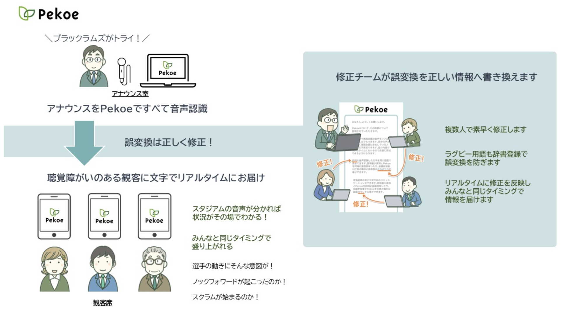 リコーブラックラムズ東京では、NTT JAPAN RUGBY LEAGUE ONE 2025-26 ホストゲーム会場にて聴覚障がい者向けサービスを実施することが決定いたしました。株式会社リコーが開発した聴覚障がい者向けコミュニケーションサービス「Pekoe -ペコ-」を導入し、スタジアムMCの音声をリアルタイムで文字化して、専用サイトを通じてタブレットやスマートフォンに表示します。