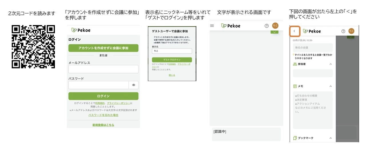 専用アプリをダウンロードし、記録開始を実行するだけで文字化することが可能。共有URLを発行すれば、複数人でPekoeを利用することができる。表示されたテキストに間違いがあっても、リアルタイムで修正が可能。