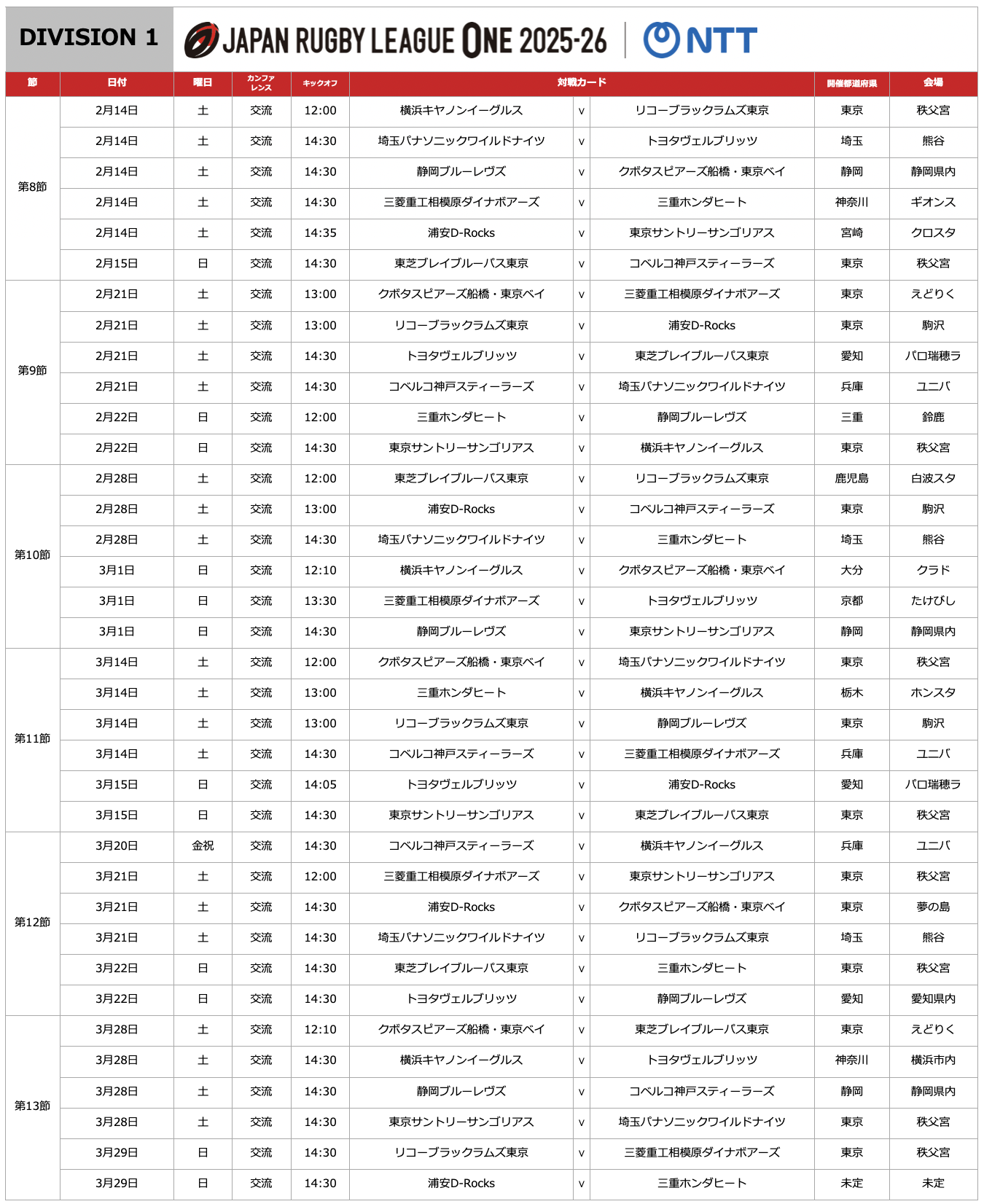 本日発表しました、「NTTジャパンラグビー リーグワン2025-26 D1第8-13節/D2第6-9節/D3第6-10節キックオフ時間/一部試合日程決定のお知らせ」のキックオフ時間について、一部変更がありましたので、お詫びして訂正いたします。