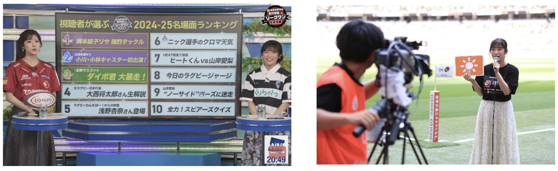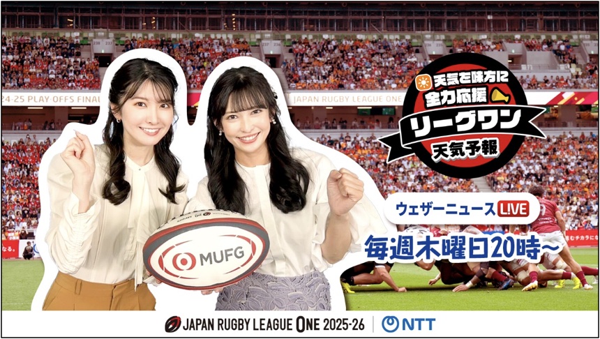 「NTTジャパンラグビー リーグワン2025-26」シーズン中、24時間365日生放送の気象情報番組「ウェザーニュースLiVE」にて、毎週木曜日の「ウェザーニュースLiVE・ムーン」(20:00〜23:00)の中で実施し、第1回目は12月13日(土)の開幕戦に合わせて12月11日(木)に配信予定です。また、YouTubeでのライブ配信に加えて、ショート動画での展開も行います。