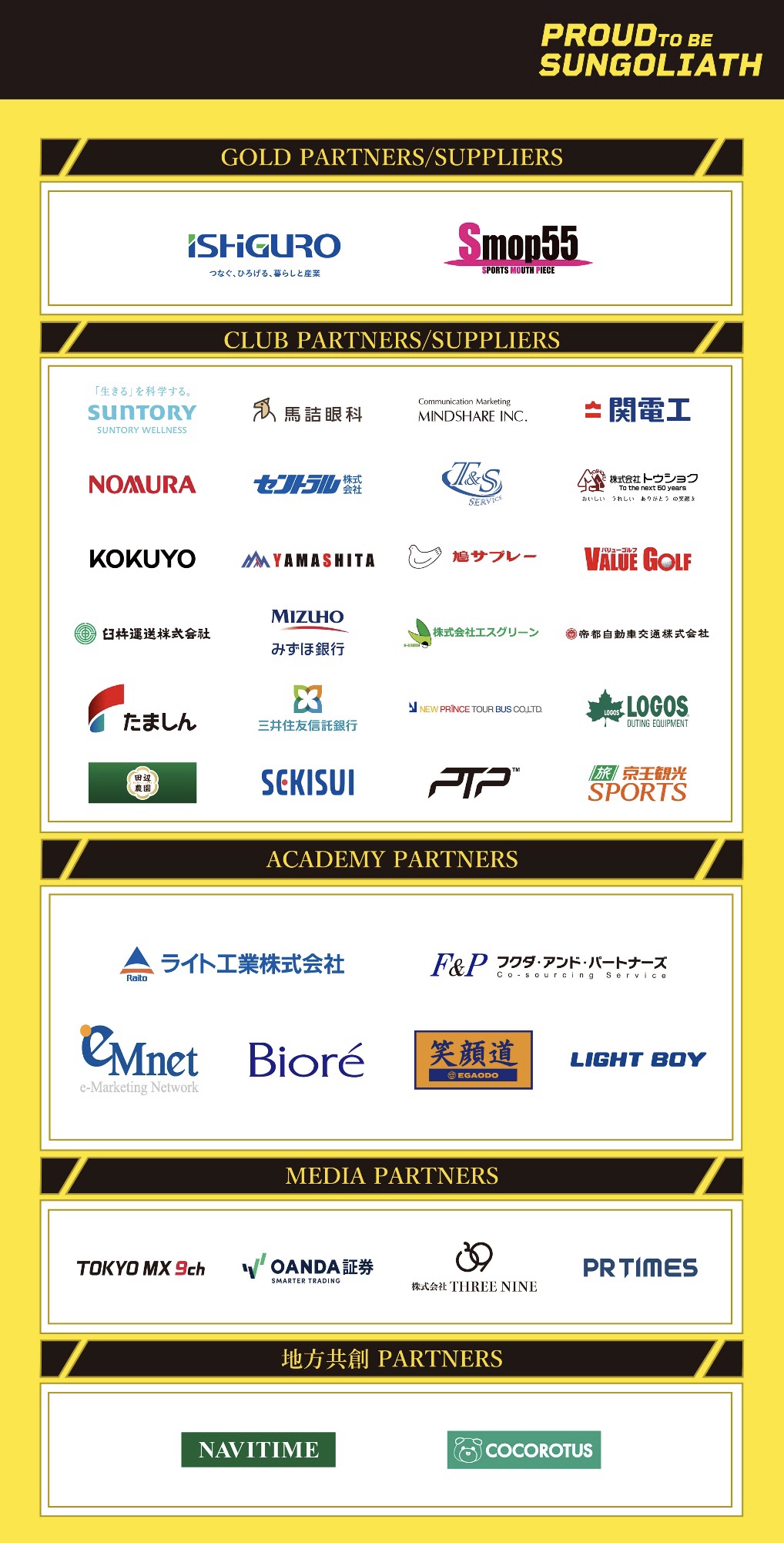 東京サントリーサンゴリアスは、今シーズンのスローガンに"PROUD TO BE SUNGOLIATH"を掲げ、グラウンド内外で "サンゴリアスらしさ"にこだわり、"アグレッシブ・アタッキング・ラグビー"を追求し、タイトル獲得に向けパートナーの皆様と共に、チーム一丸となって臨みます。