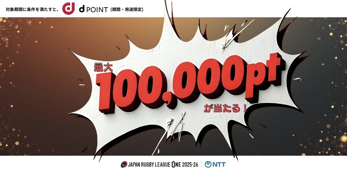 NTTジャパンラグビー リーグワン2025-26 リーグ戦・プレーオフトーナメント・入替戦の入場チケットを合計3試合以上、総額5,000円(税込)以上購入し、対象期間中に条件達成いただいた方の中から抽選で計15名様に10万ポイント、300名様に5,000ポイントのdポイントをプレゼントします。
