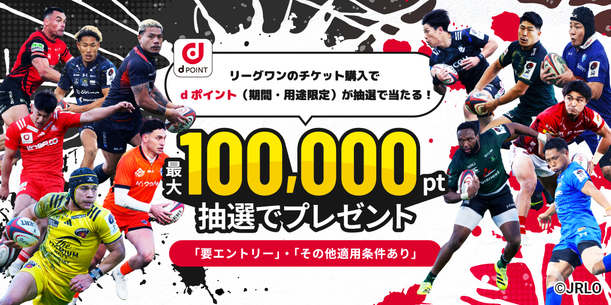 ジャパンラグビーリーグワンは、日頃からリーグワンを応援してくださる皆様への感謝を込め、NTTジャパンラグビー リーグワン2025-26シーズンの試合観戦でdポイントが最大10万ポイントもらえる「dポイントプレゼントキャンペーン」を実施いたします。
