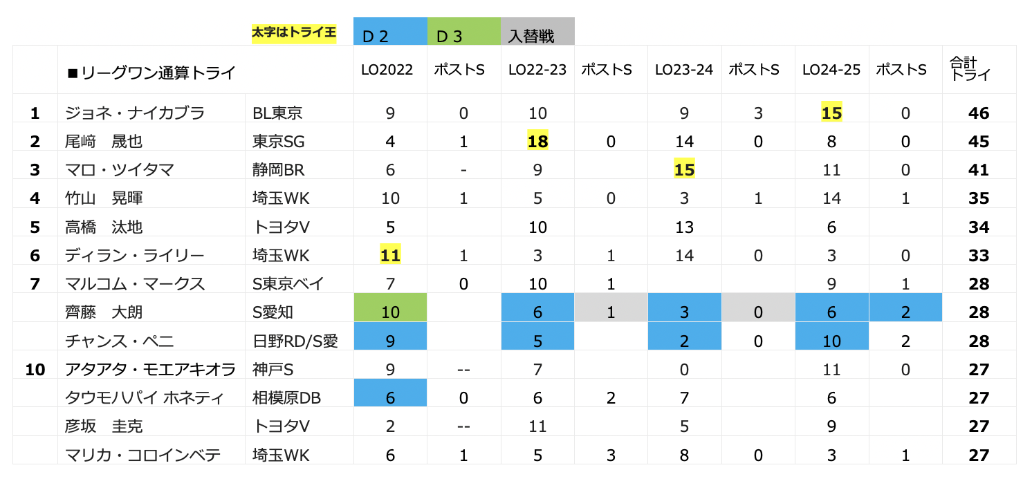昨季終了時点のリーグワン通算トライランキングTOP10を以下に示す。