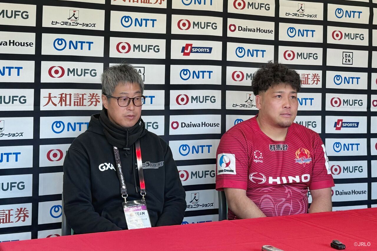 試合については、セットピースが安定せず、攻撃の時間が短くなり、そのぶんディフェンスをする時間が長くなってしまいました。そうした場面が今日の結果の大きな要因だと感じています。もう一度セットピースを修正し、われわれが目指している日野レッドドルフィンズ(以下、日野RD)らしいラグビーをしっかり表現できるよう、次の豊田自動織機シャトルズ愛知戦に向けて準備していきたいと思います。本日はありがとうございました」