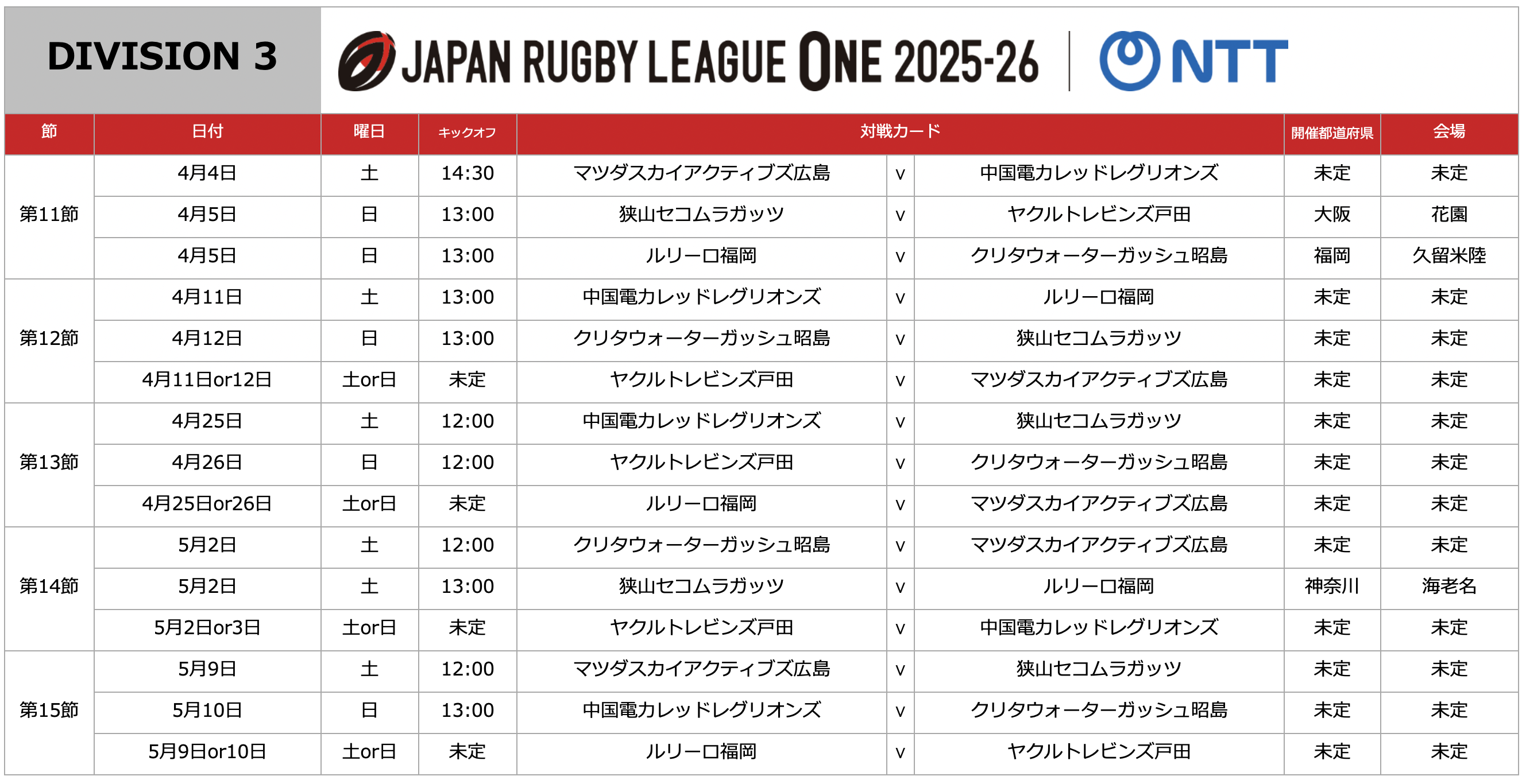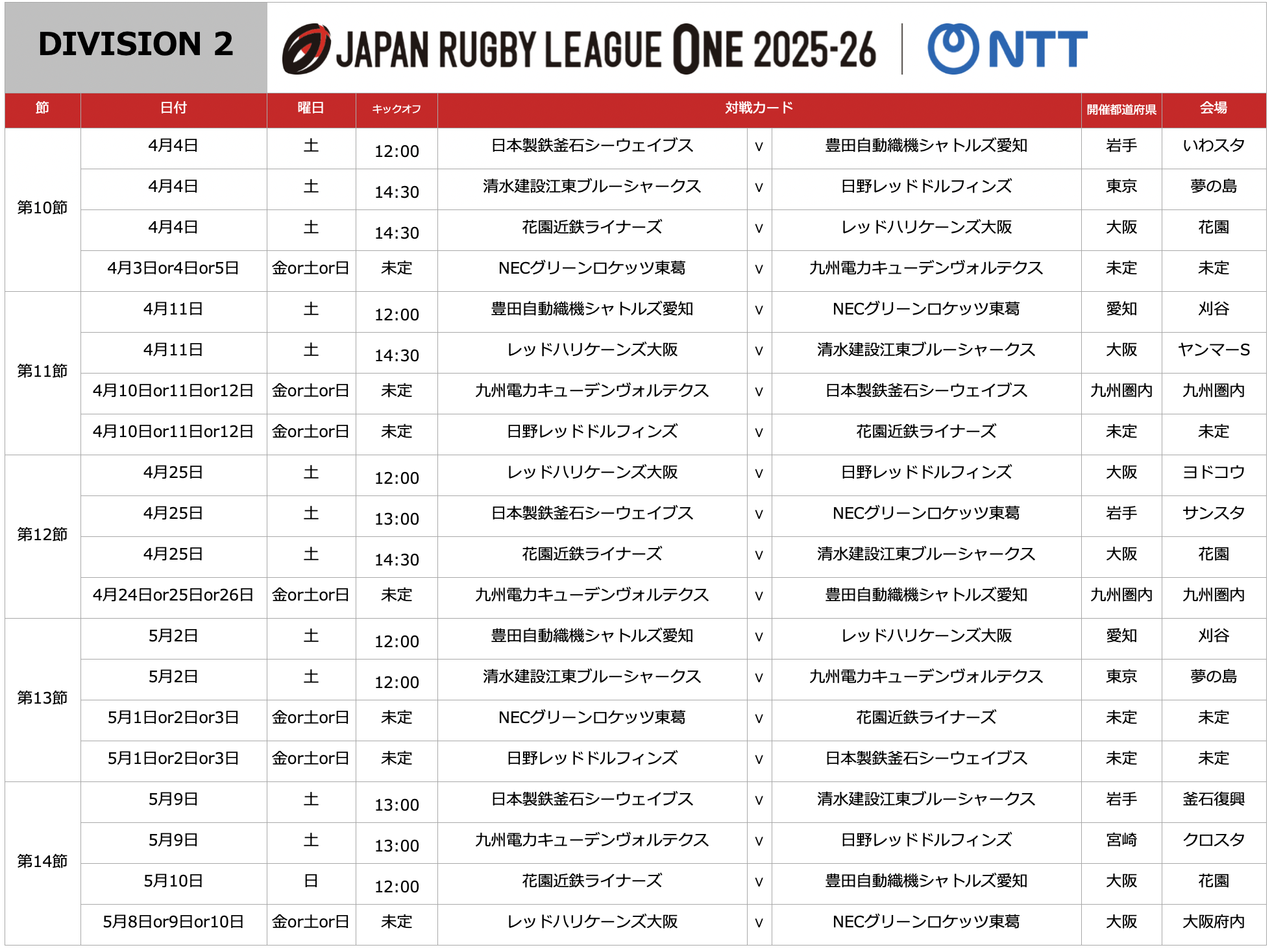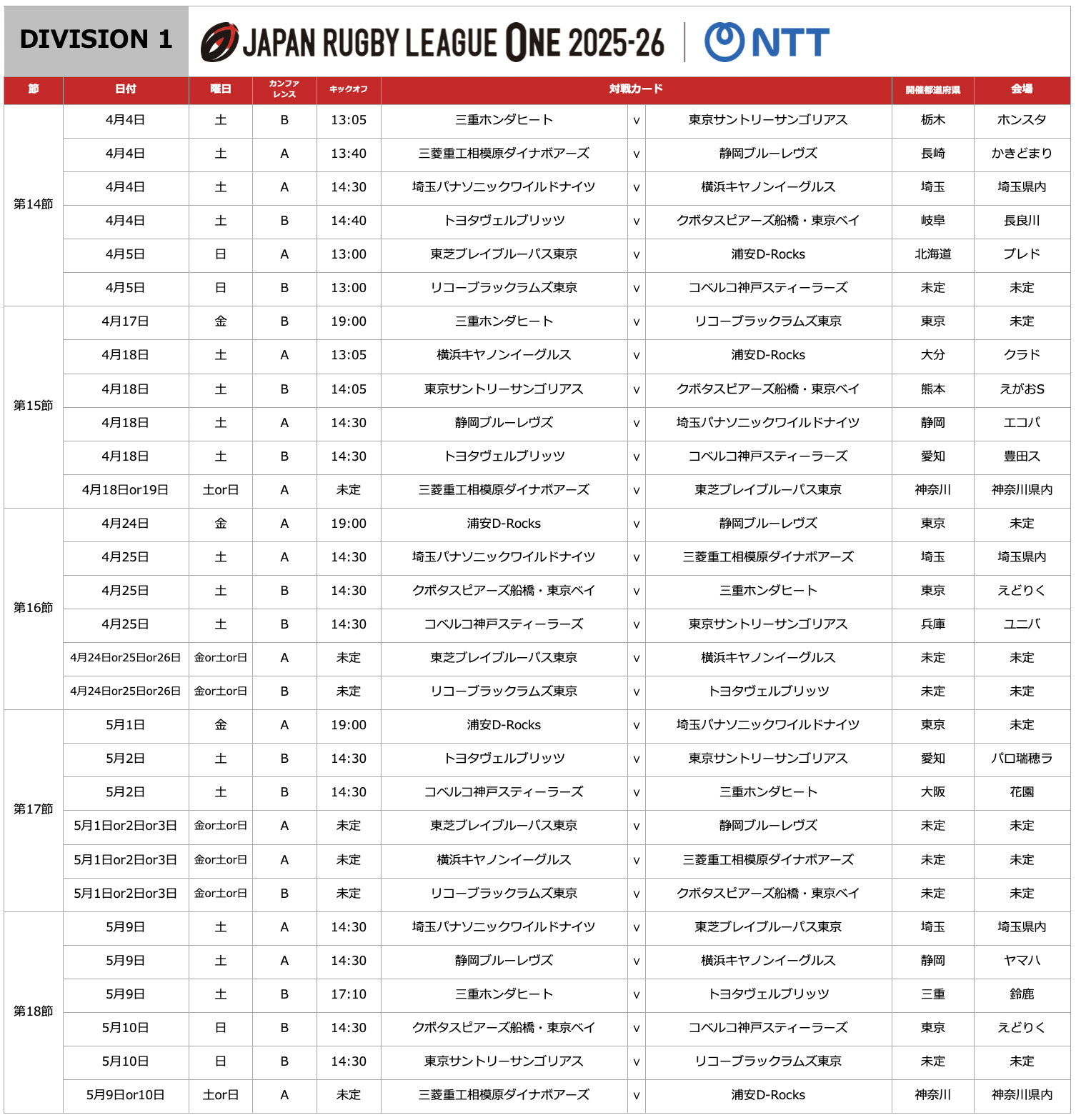NTTジャパンラグビー リーグワン2025-26 ディビジョン1の第14節から第18節、ディビジョン2の第10節から第14節、ディビジョン3の第11節から第15節のキックオフ時間が決定しましたので、お知らせいたします。また、一部試合の試合日程および会場についても追加決定がございましたのでお知らせいたします。その他の試合のキックオフ時間は決定次第お知らせいたします。
