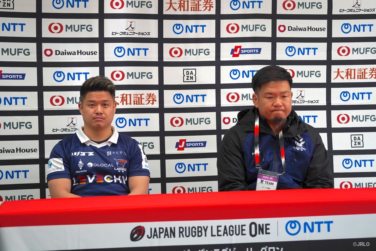 「寒い中、多くの方に会場へ足を運んでいただき、本当にありがとうございました。チームとしては、ヘッドコーチが話したとおり、ブレイクダウンで相手のキープレーヤーとなる外国籍選手を止めることをテーマに、この1週間準備してきました。前半の入りは、自分たちの流れにもち込めたと思います。ただ、そこから自分たちのミス、いわゆる自滅で崩れてしまったのが反省点です」