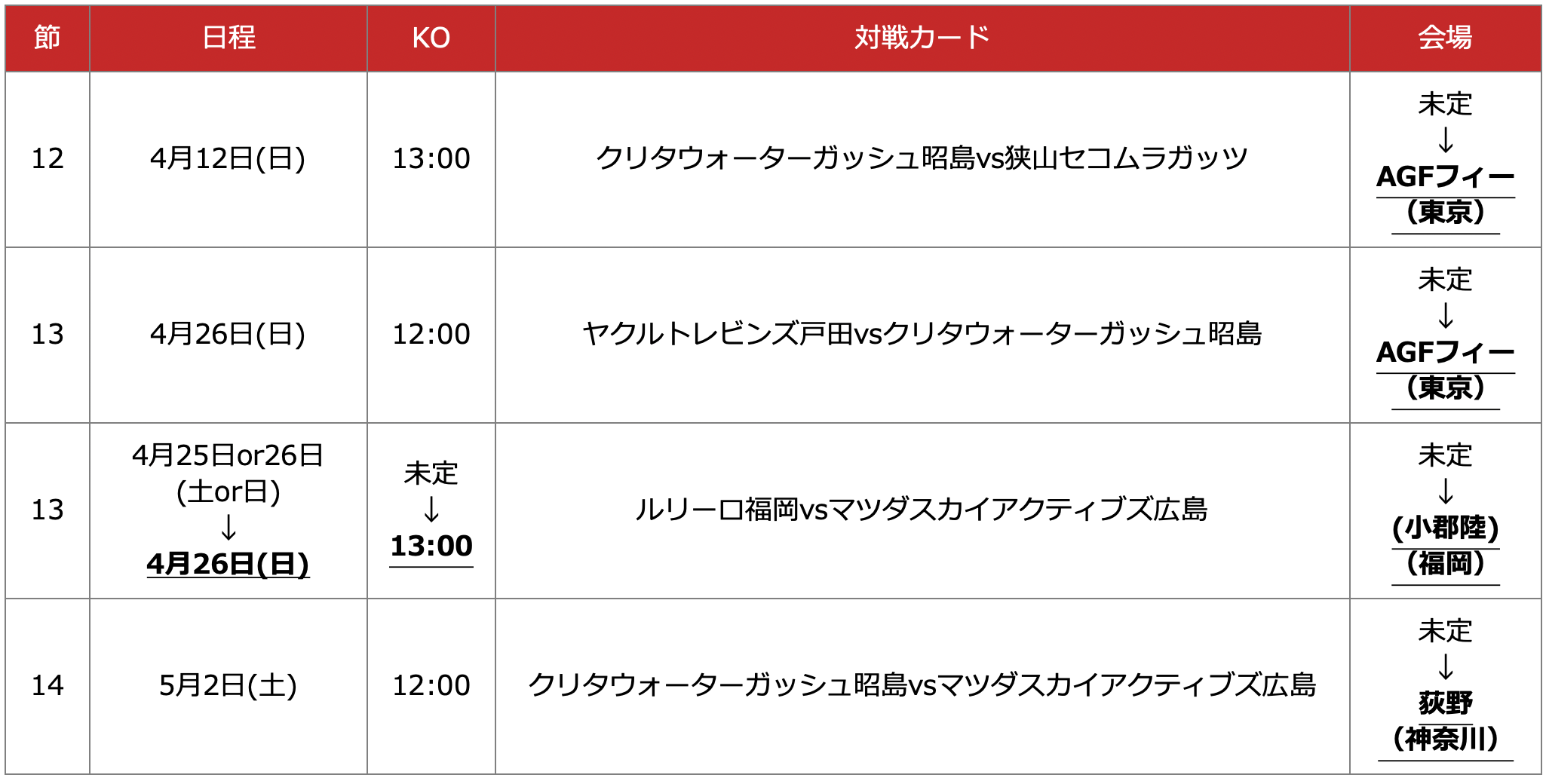 2026.02.03NTTジャパンラグビー リーグワン2025-26 一部試合日程・会場およびキックオフ時間追加決定のお知らせお知らせ#ディビジョン1#ディビジョン3NTTジャパンラグビー リーグワン2025-26の一部試合日程・会場およびキックオフ時間について、以下の通り追加決定がございましたので、お知らせいたします。試合日程・会場およびキックオフ時間追加決定※以下、下線・太字が追加決定箇所■ディビジョン1※ユアスタ:ユアテックスタジアム仙台■ディビジョン3※AGFフィー:AGFフィールド※小郡陸:小郡市陸上競技場※荻野:厚木市荻野運動公園競技場ニュース一覧