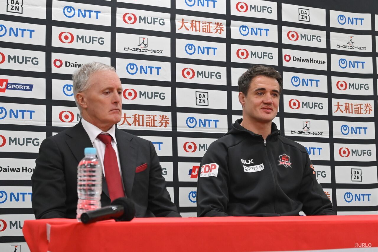 東芝ブレイブルーパス東京のトッド・ブラックアダー ヘッドコーチ(右)、リーチ マイケル キャプテン東芝ブレイブルーパス東京