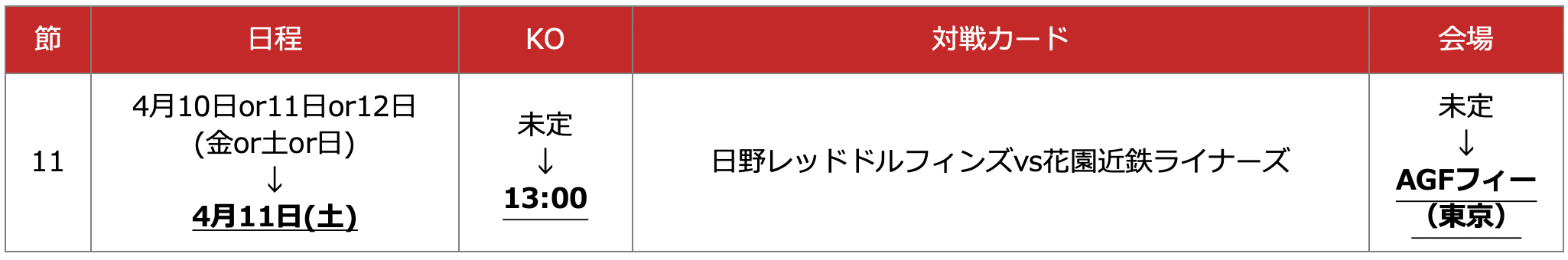 2026.02.10NTTジャパンラグビー リーグワン2025-26 一部試合日程・会場およびキックオフ時間追加決定のお知らせお知らせ#ディビジョン1#ディビジョン2NTTジャパンラグビー リーグワン2025-26の一部試合日程・会場およびキックオフ時間について、以下の通り追加決定がございましたので、お知らせいたします。試合日程・会場およびキックオフ時間追加決定※以下、下線・太字が追加決定箇所■ディビジョン1※ギオンス:相模原ギオンスタジアム■ディビジョン2※AGFフィー:AGFフィールドニュース一覧