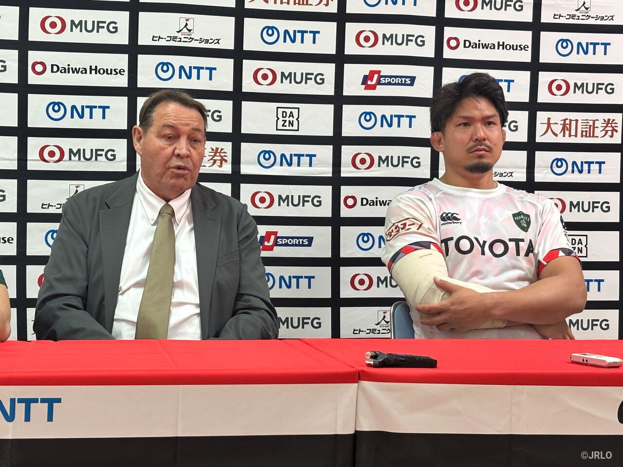 トヨタヴェルブリッツのスティーブ・ハンセン ヘッドコーチ(左)、姫野和樹キャプテントヨタヴェルブリッツ