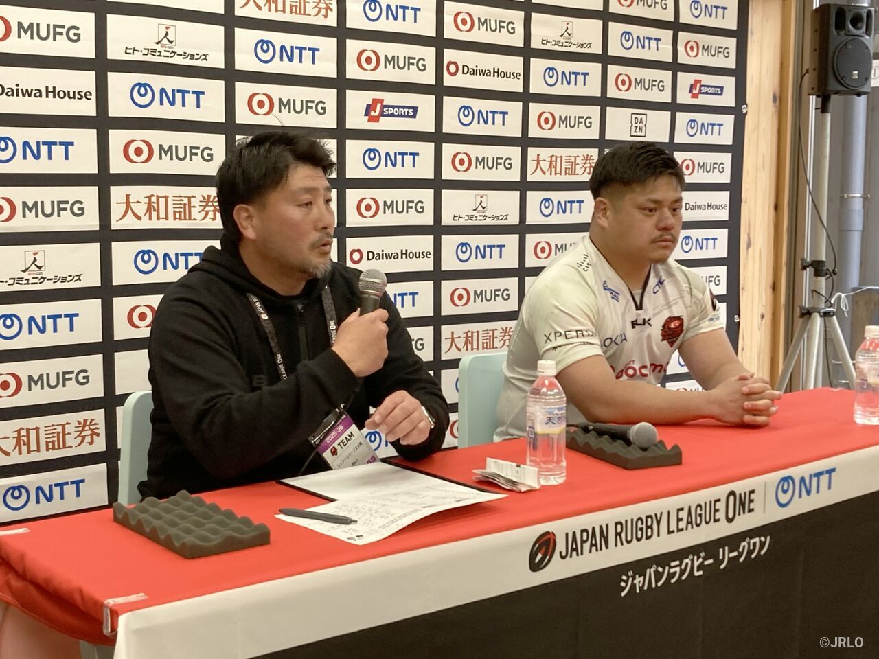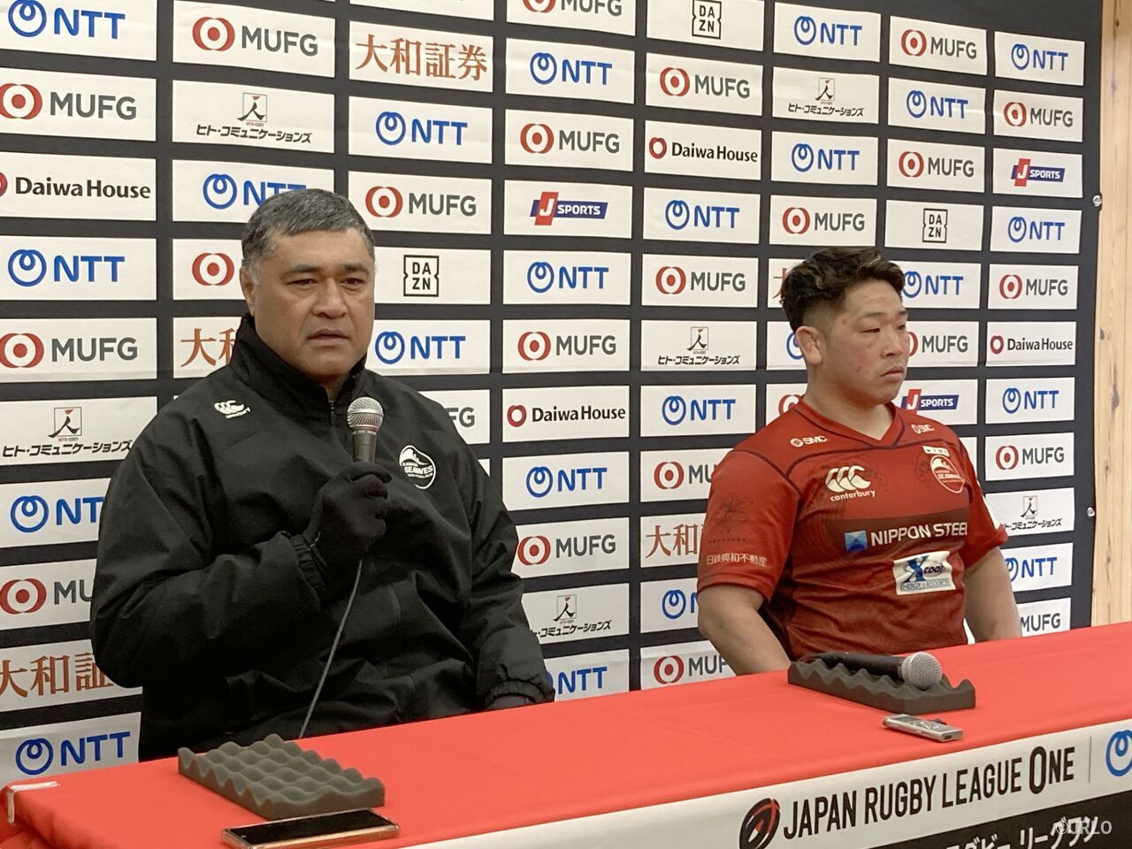 日本製鉄釜石シーウェイブスのトウタイ・ケフ ヘッドコーチ(左)、河野良太キャプテン日本製鉄釜石シーウェイブス