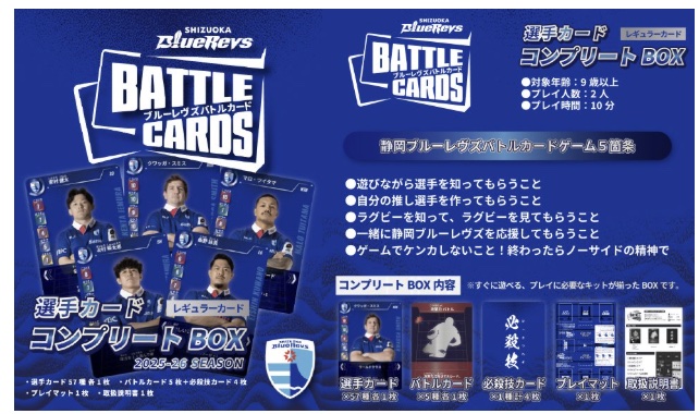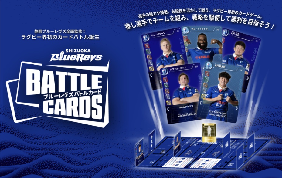 静岡ブルーレヴズはこのたび、選手をモチーフにしたカードゲーム型オフィシャルグッズ、<2025-26ブルーレヴズ選手バトルカード>を発売いたします。本商品は、ブルーレヴズの選手たちがカードとなり、それぞれの能力や特徴を活かして対戦を楽しめるカードゲームです。カードを収集してチームを編成、能力に応じた戦略を駆使して対戦することで、ラグビーや選手の魅力をゲームで体験することができます。ラグビー界において「選手で戦うカードゲーム型オフィシャルグッズ」は初の商品化※となります(※当社調べ)。本商品を通じてファンの皆様と、新しくより深い接点を創出し、ラグビーの魅力をより多くの方へお届けしてまいります。
