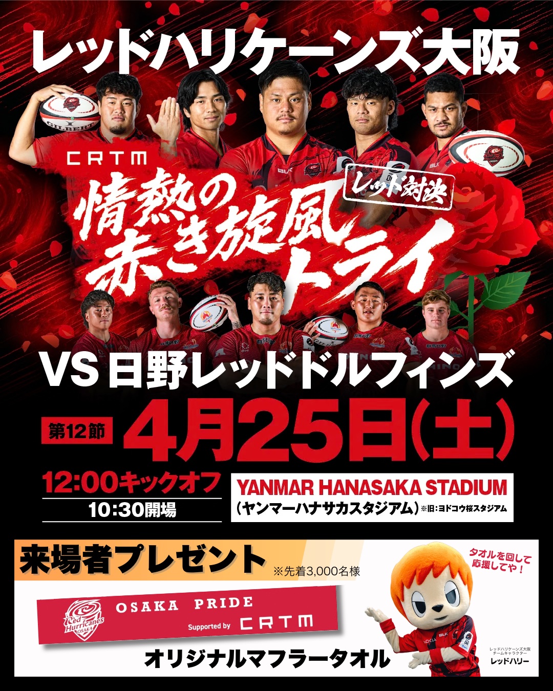 この度、レッドハリケーンズ大阪は2026年4月25日(土)にYANMAR HANASAKA STADIUM※1で開催する、NTT JAPAN RUGBY LEAGUE ONE 2025-26 DIVISION 2 第12節のホストゲーム(日野レッドドルフィンズ戦)をレッドハリケーンズ大阪のトップパートナーであり、関西最大級のコールセンターを有する株式会社カスタマーリレーションテレマーケティングの協賛による「CRTM 情熱の赤き旋風トライ」として開催することが決定しましたのでお知らせいたします。