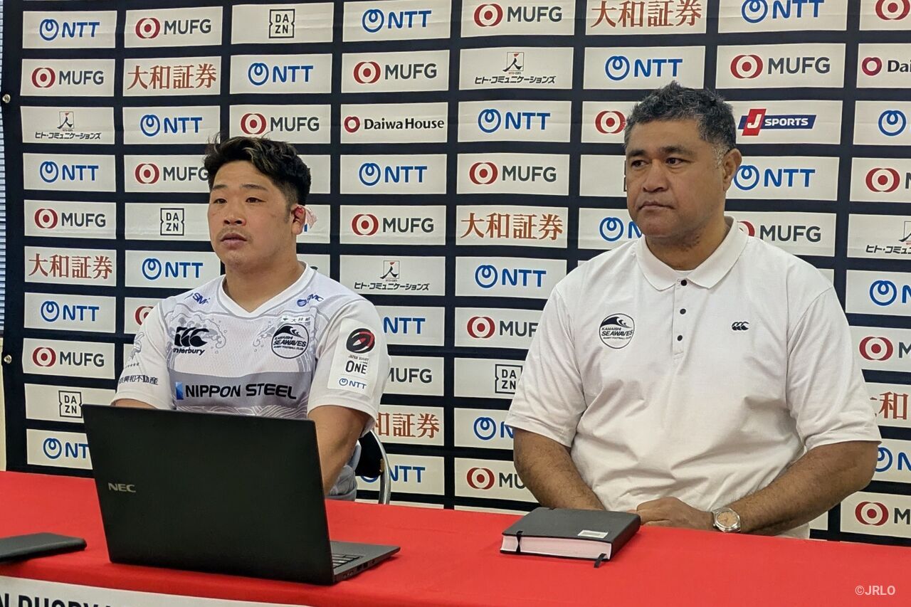 「日本製鉄釜石シーウェイブス(以下、釜石SW)はブレイクダウンでフィジカル的なプレッシャーを掛けてくるチームです。その強度に対して、立ち上がりは十分に対応できていなかったと感じています。ただ、選手たちがその状況を認識し、より強く戦う必要があると理解してからは、しっかりと対応できるようになり、流れを引き戻すことができました」
