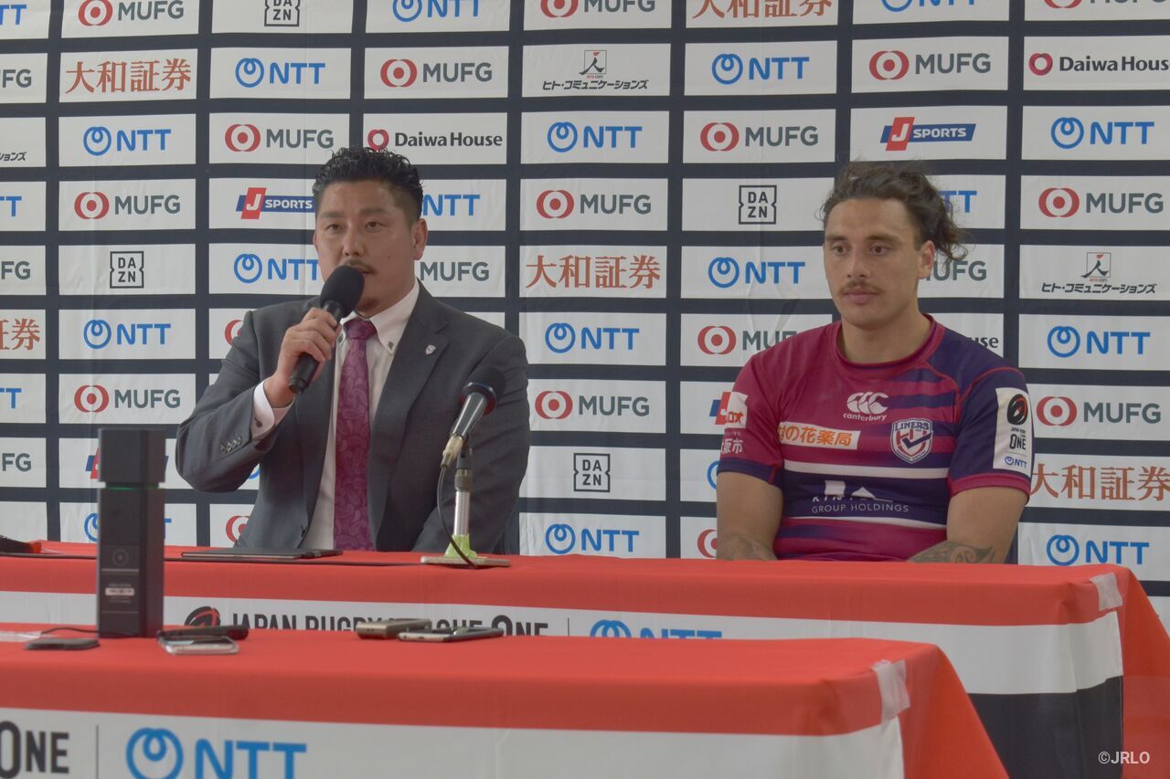 「みなさん、こんにちは。試合の中では随所に良いプレーが見られました。セットピースからのトライやスクラムからのトライを奪えたほか、スキル面やカウンターアタック、ディフェンスへの切り替えも良かったと思います。一方で課題としては、ブレイクダウンの一貫性が挙げられます。特に後半開始直後の場面で十分な対応ができませんでした。ただ、試合に勝てたこと、そしてファンの皆さまの前で勝利できたことは非常にうれしく思います」
