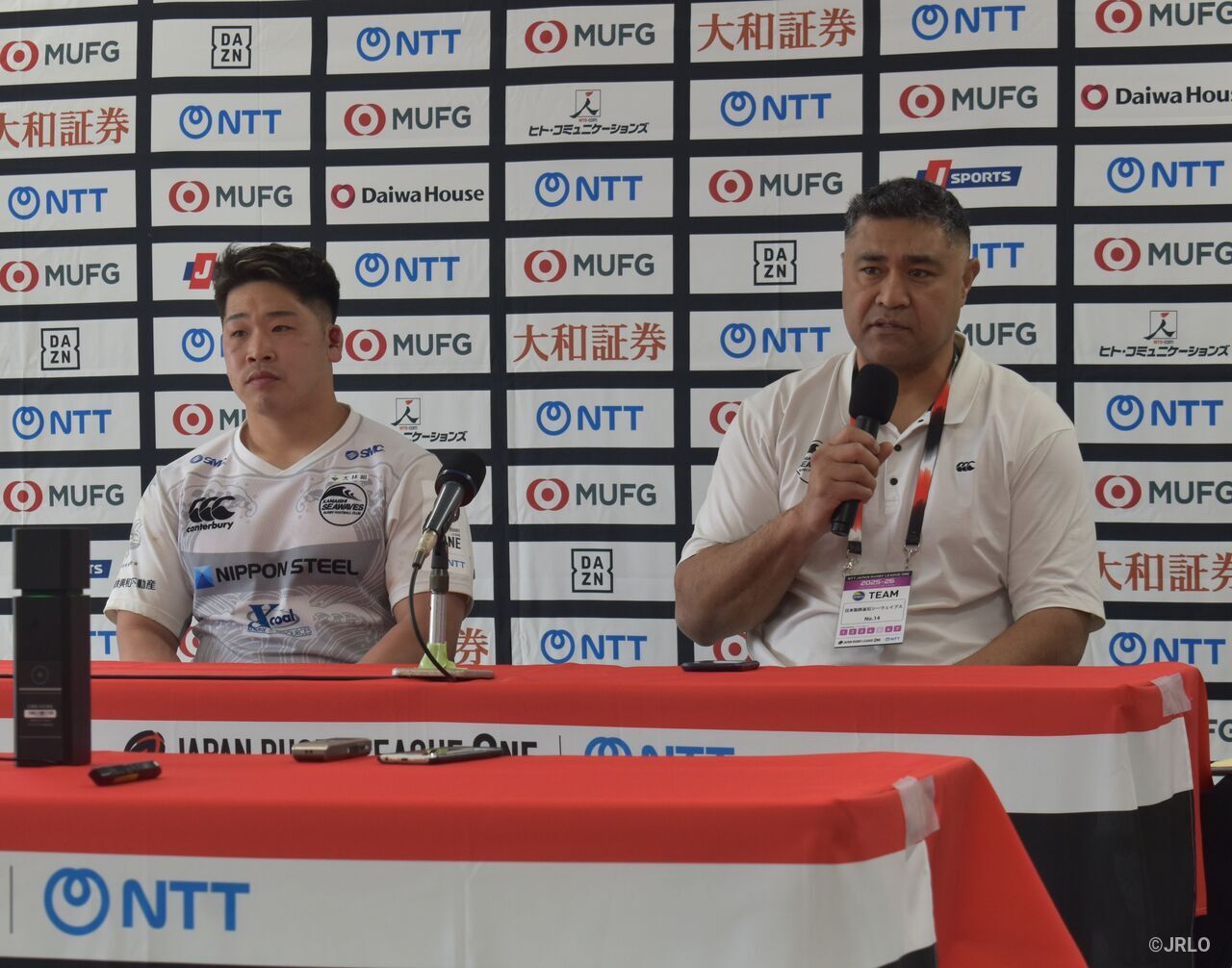 日本製鉄釜石シーウェイブスのトウタイ・ケフ ヘッドコーチ(右)、河野良太キャプテン日本製鉄釜石シーウェイブス