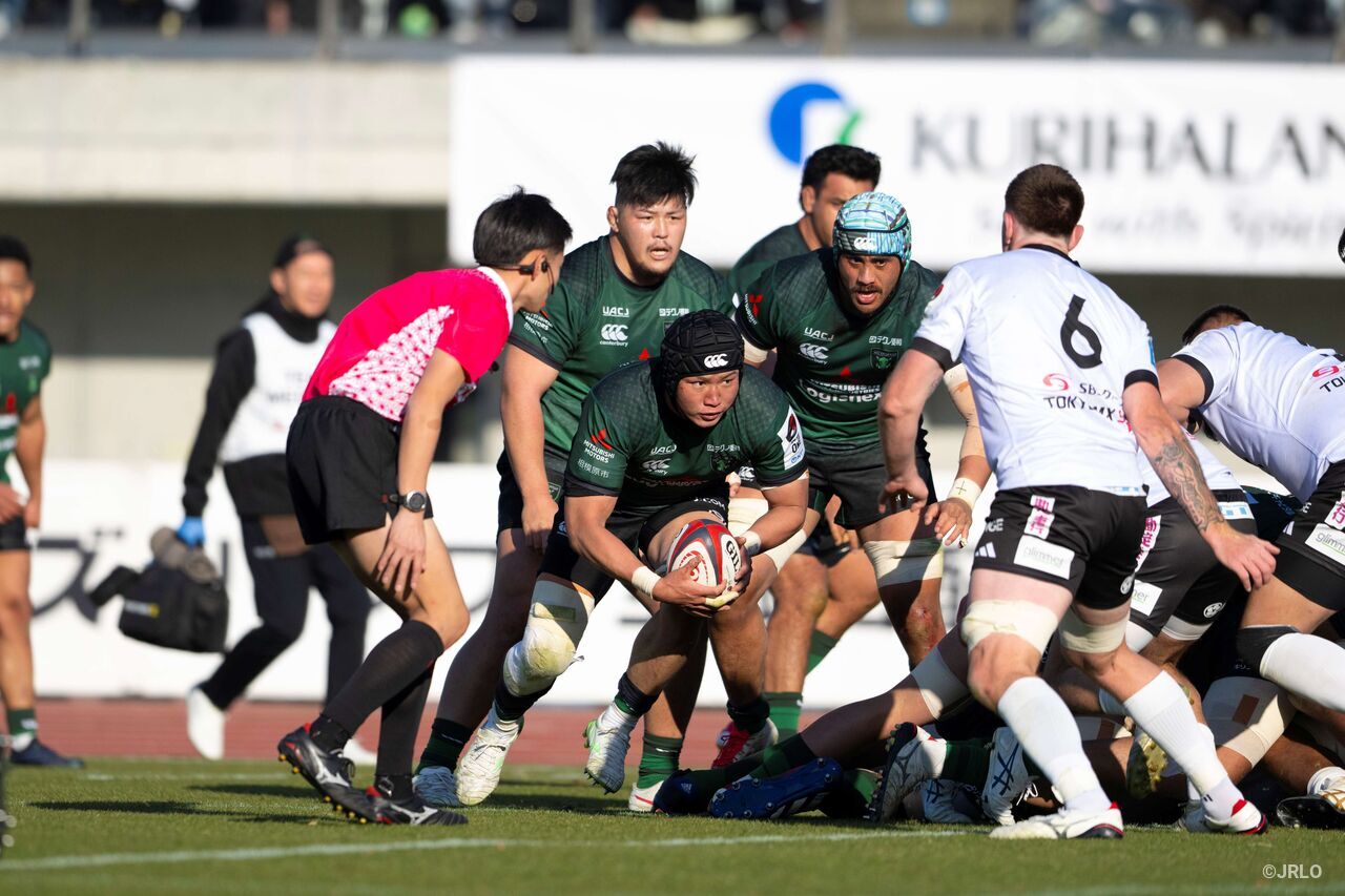 三菱重工相模原ダイナボアーズの吉田杏キャプテン(ボールキャリア)。自身のパフォーマンスについても「時間あたりの質を上げること」を追求している三菱重工相模原ダイナボアーズ(以下、相模原DB)は今節、長崎県のベネックス総合運動公園かきどまり陸上競技場で静岡ブルーレヴズと対戦する。降雪による試合中止の影響でバイウィークが消滅し、チームは想定外の8連戦中。その前段を含めれば、9週間にわたり、緊張感の続く日程を戦ってきた。