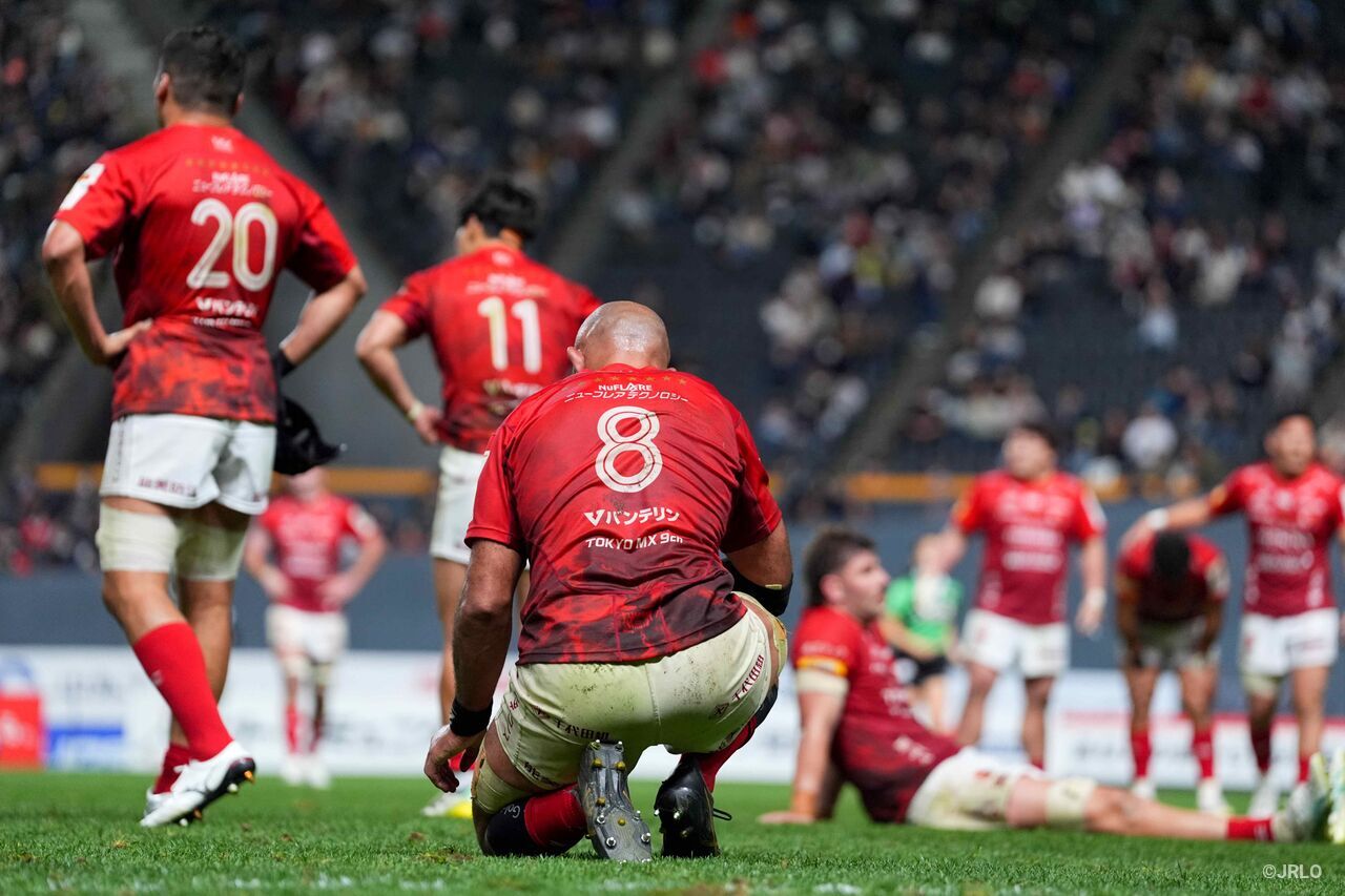 試合が終わり片ひざをつく、リーチ マイケル キャプテンこの日のBL東京はスクラム、ラインアウトモールでじりじりと、我慢強く前に出た。1mでも、1cmでも前へ──。赤いジャージーの塊が前進する度に歓声は大きくなり、8人のフォワードは体を張って相手に圧力を掛け続けた。