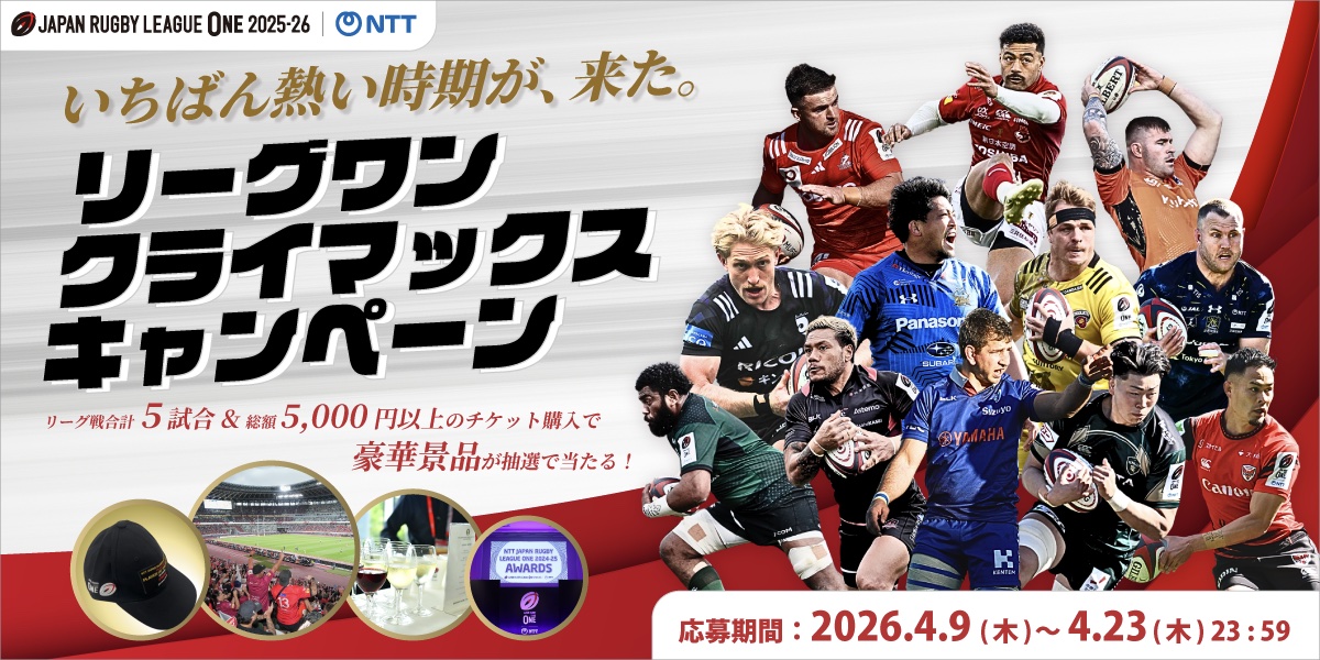 一般社団法人ジャパンラグビーリーグワンは、NTTジャパンラグビー リーグワン2025-26のシーズン終盤期に合わせ、2025-26シーズンの試合を観戦した方の中から抽選で豪華景品が当たる「リーグワンクライマックスキャンペーン」 (以下、本キャンペーン)を2026年4月9日(木)から開始します。