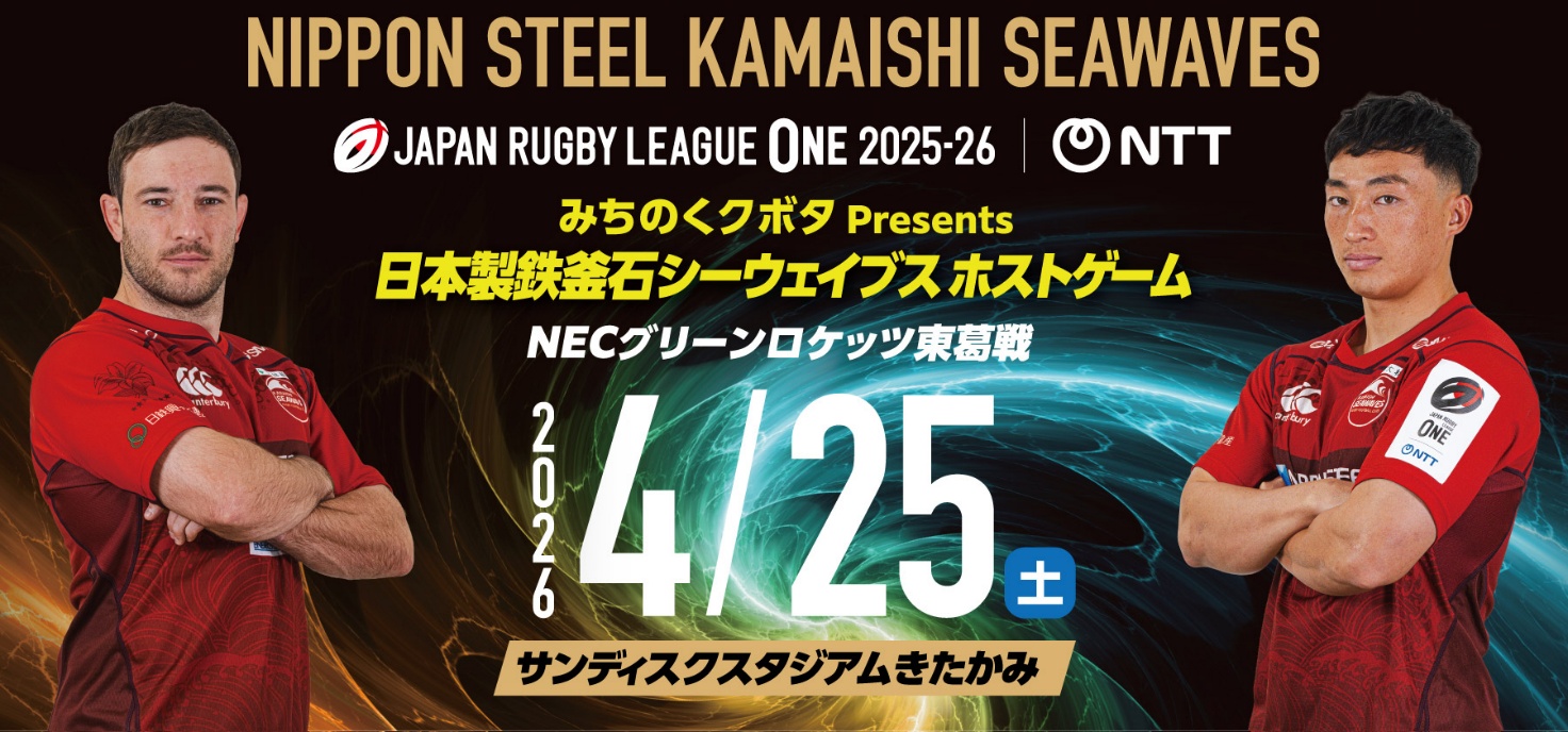 2026年4月25日(土) 13:00キックオフ、サンディスクスタジアムきたかみにて開催するNTTジャパンラグビー リーグワン2025-26 ディビジョン2 第12節 日本製鉄釜石シーウェイブス vs NECグリーンロケッツ東葛 のマッチデースポンサーとタイトルが決定いたしましたのでお知らせいたします。