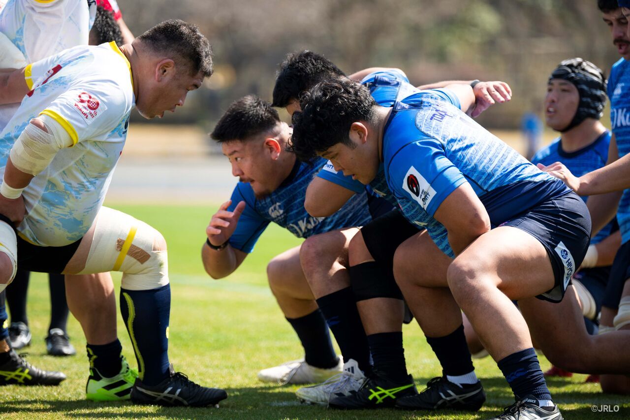 一時期フッカーに転ずる必要に迫られた田草川だが、その経験が活きているという(写真手前、左プロップ)今季から、新たに取り組んでいることもある。試合映像を見返し、良かった点と課題をノートに書き出すレビューの習慣だ。「良い部分は伸ばし、悪い部分も何度もチャレンジする。その繰り返しで精度が上がってきた」と、自ら考え、言語化することでプレーの理解を深めている。また、後輩ができたことも大きな変化の一つだ。教える立場になることで自分の動きを見直す必要が生まれた。動画を見返さなければ説明できない場面もあり、その過程で、自分のプレーや判断の精度をより深く理解できるようになったという。