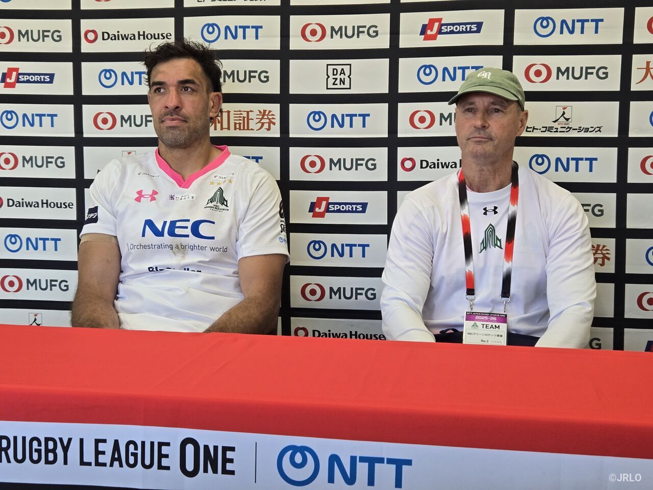 NECグリーンロケッツ東葛のグレッグ・クーパー ヘッドコーチ(右)、ローリー・アーノルド キャプテンNECグリーンロケッツ東葛