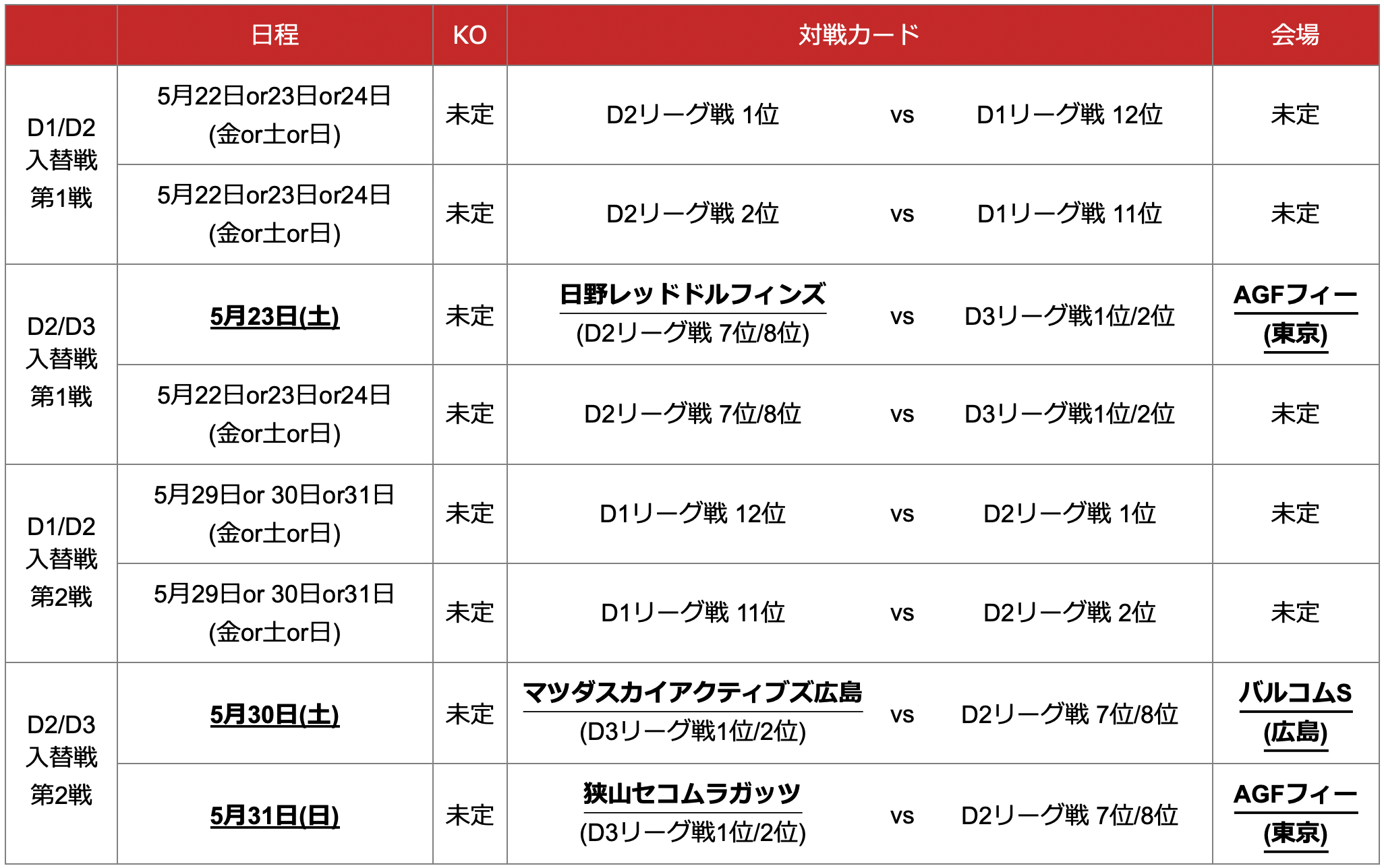 2025-26シーズンは、D1下位2チーム、D2上位/下位2チーム、D3上位2チームが入替戦に出場します。