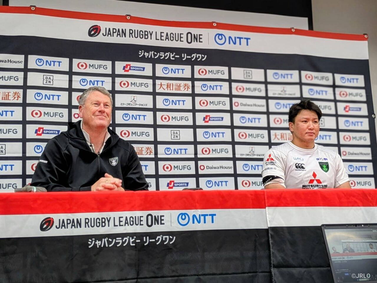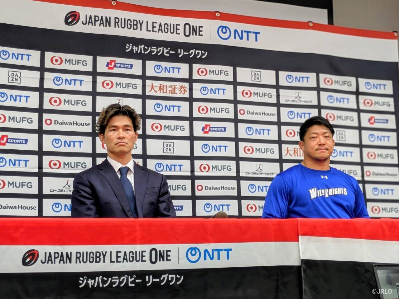 埼玉パナソニックワイルドナイツの金沢篤ヘッドコーチ(左)、坂手淳史キャプテン埼玉パナソニックワイルドナイツ