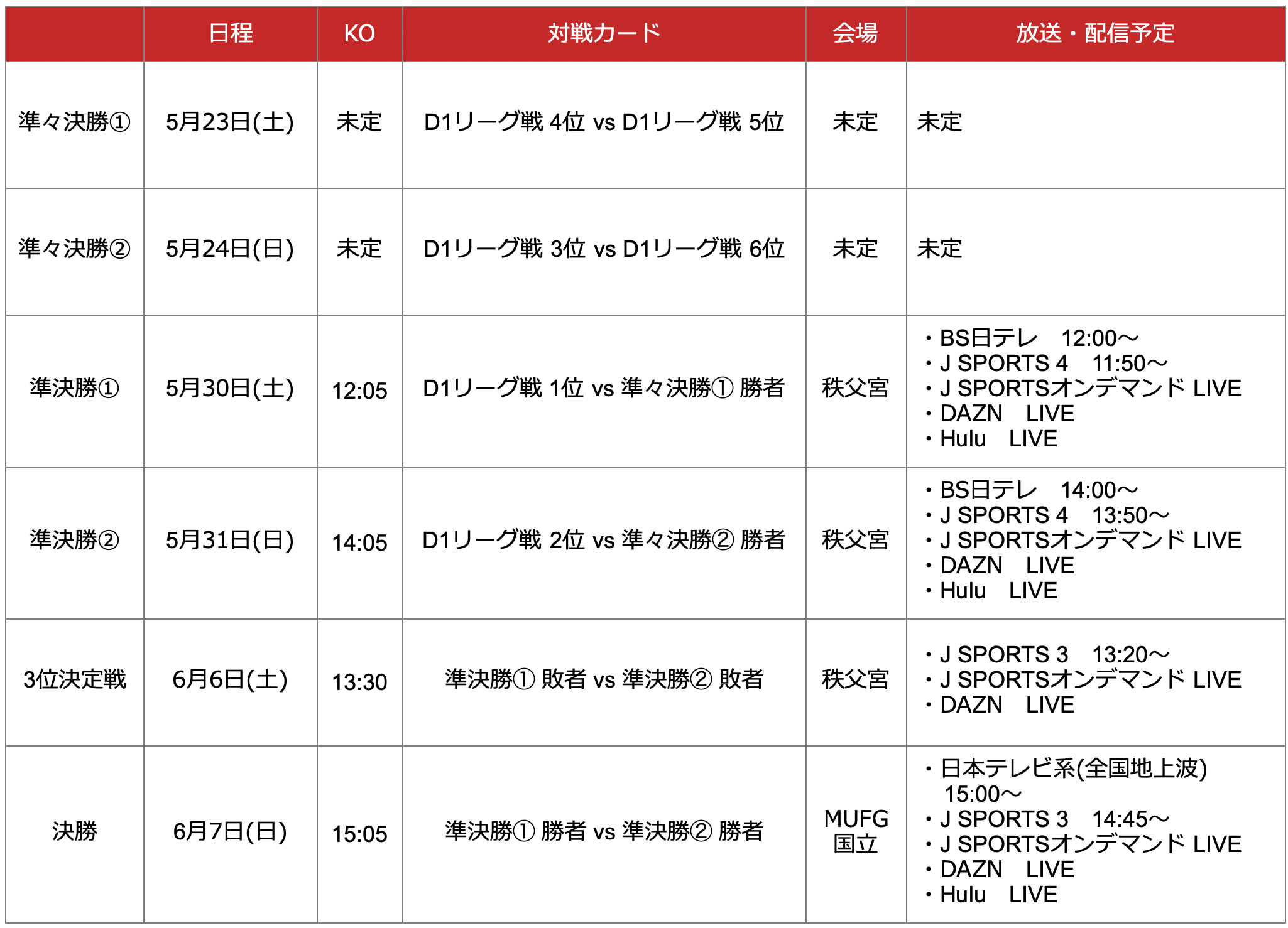 プレーオフトーナメント全試合をJ SPORTSおよびDAZNで生中継、J SPORTSオンデマンドでライブ配信します。準決勝2試合はBS日テレで生中継、決勝を日本テレビ系全国地上波で生中継いたします。さらにHuluでは、準決勝2試合と決勝をライブ配信いたします。
